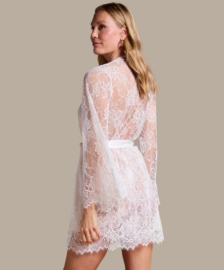 Du kommer til å elske denne blondekimonoen! Den har en semi-transparent look med satengbånd med knyting foran. Bruk den sammen med den matchende underkjolen! Del av NOIR-kolleksjonen vår.