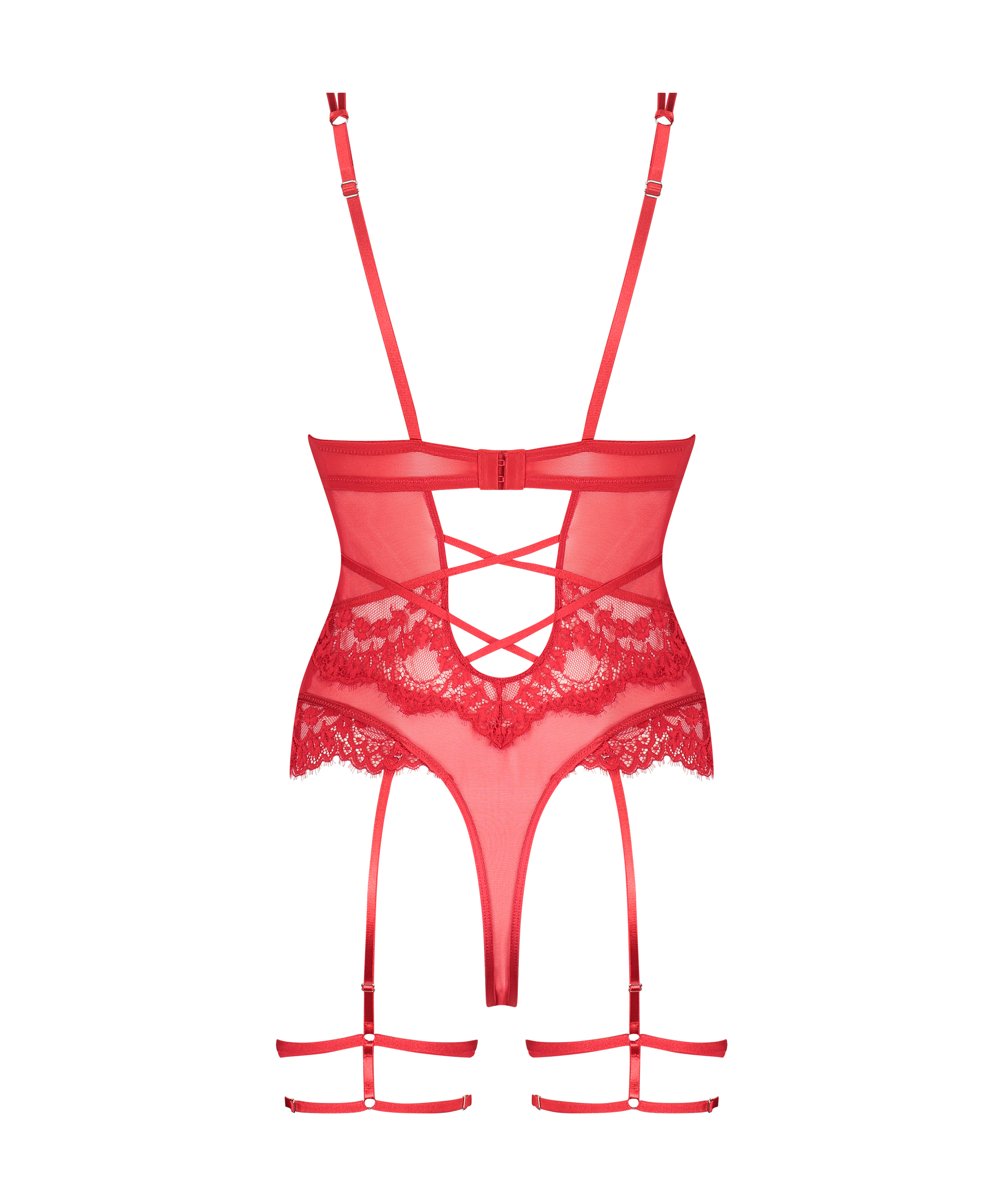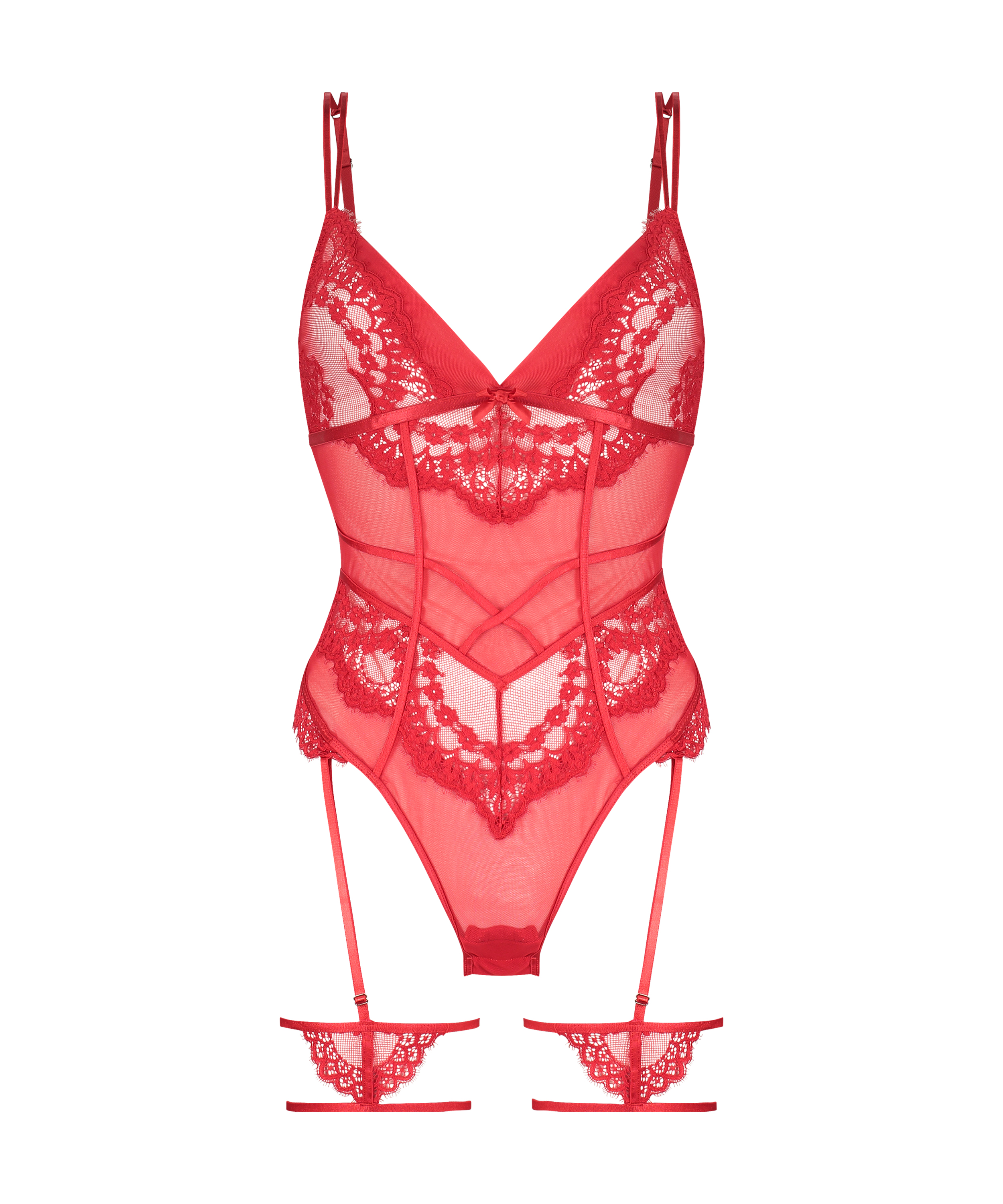 Føl deg sexy i denne vakre bodyen! Den er i et halvgjennomsiktig stoff og er dekket av blonder på fronten og skålene. De justerbare stroppene sørger for en perfekt passform. Spilene i front skaper en helt rå stil. Med den sexy blondehofteholderen med stroppedetaljer er den komplett. Kombiner med en kimono for en gjennomført stil!