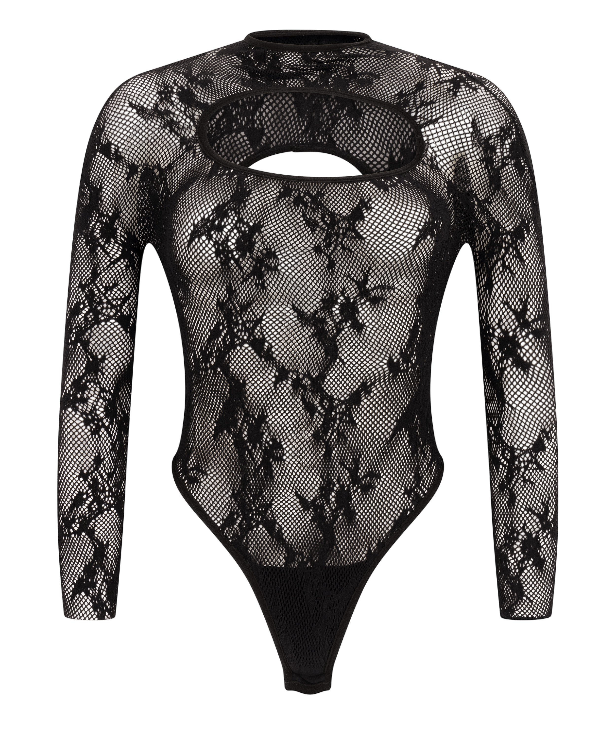 Gjør inntrykk med denne dristige fiskenettbodyen, designet for å vekke oppsikt og fremheve din selvtillit. Den er laget av fiskenettstoff og har en iøynefallende utskjæring foran som gir den elegante silhuetten et provoserende preg. Kroppen omfavner kurvene dine med en flatterende passform.