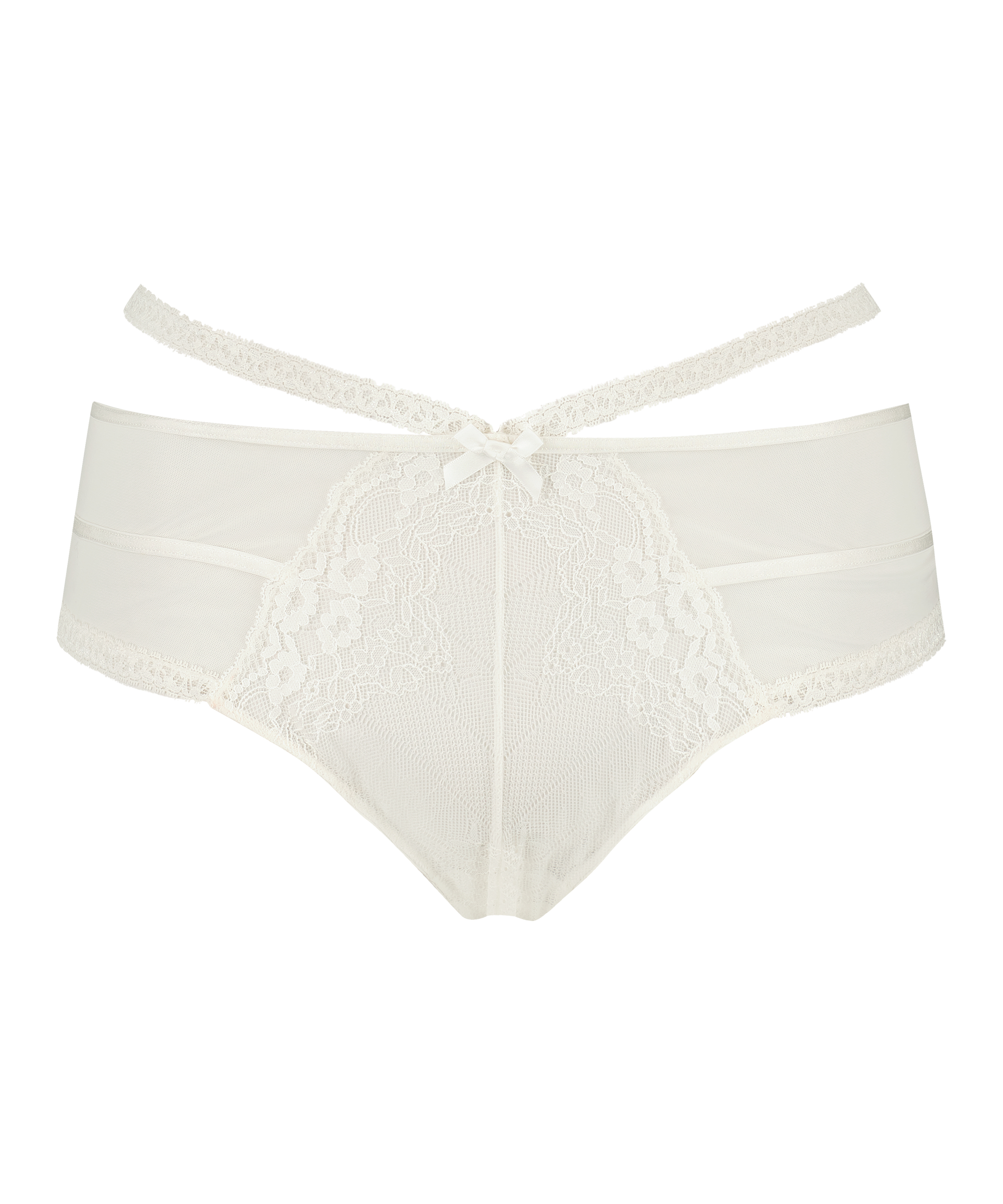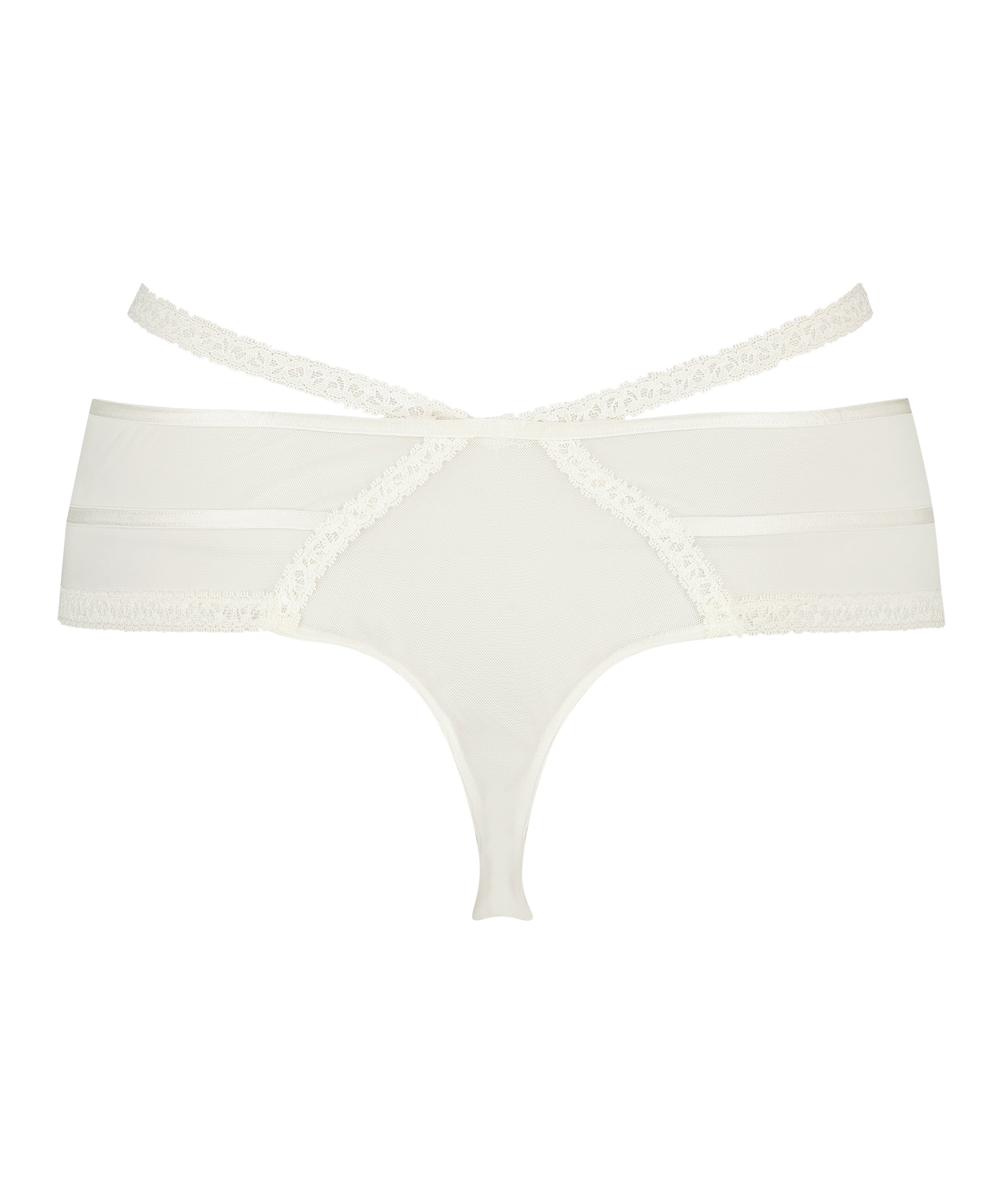 Denne g-strengen er rett og slett wow! Trusen har massevis av blonder og strappy detaljer som gir en sexy effekt. Foran er det en søt, liten sløyfe. Kombiner med matchende BH eller bralette.