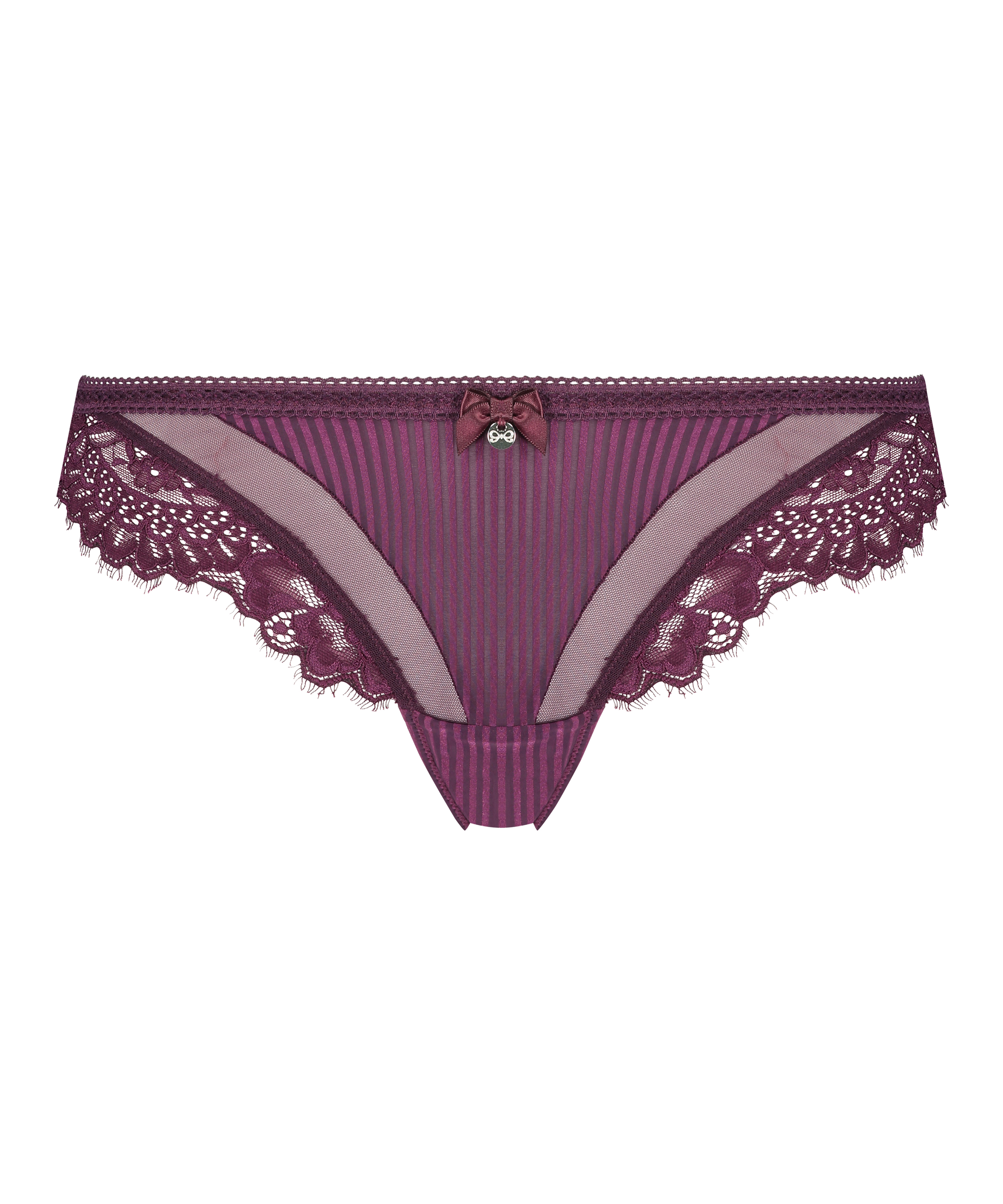 Denne brasilianeren er utstyrt med en blanding av blonder, mesh og mikrofiber. Mikrofiberstoffet er i et stripete mønster. Kombiner med den matchende BH-en og få et fullstendig sett.