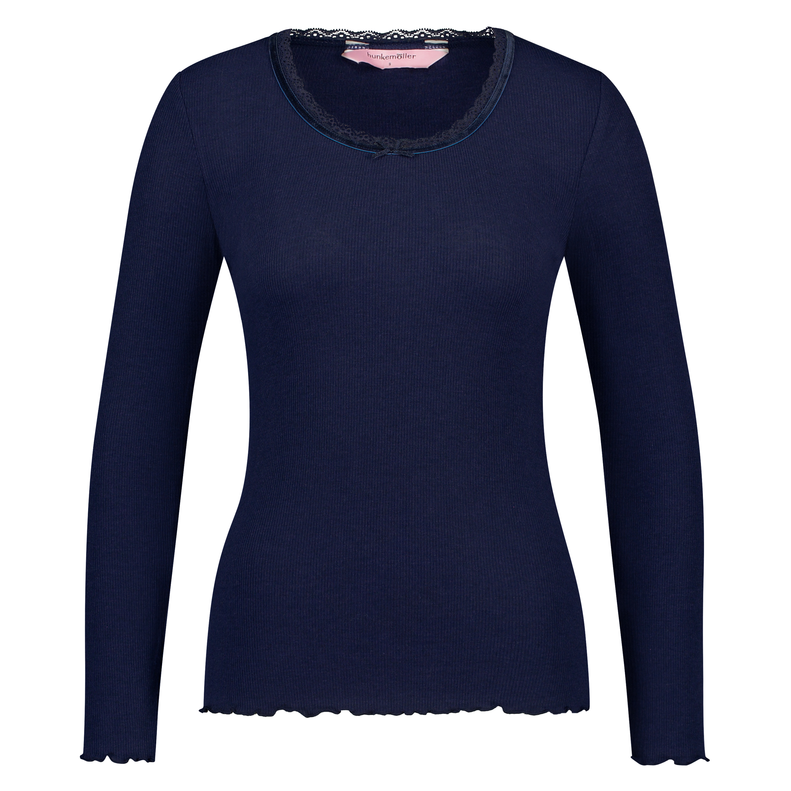 Denne langarmete toppen har en ribbestrikket tekstur. Den runde halsen avsluttes med en blonderand.