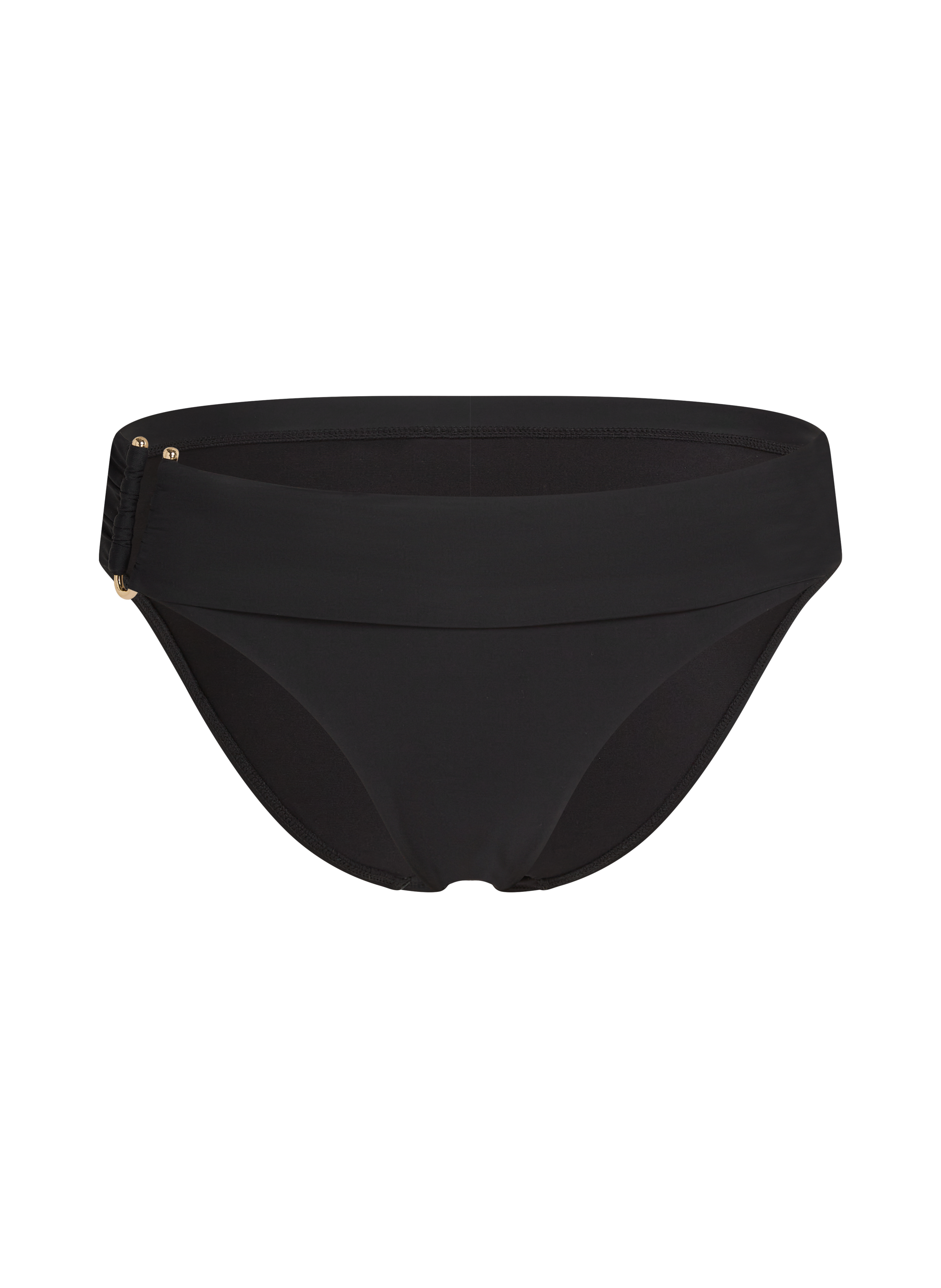 Hev badetøykolleksjonen din med denne lekre bikinitrusen! Den slanke, lav midje passformen gir en flatterende og behagelig passform, mens de luksuriøse gulldetaljene tilfører et snev av glamour.
