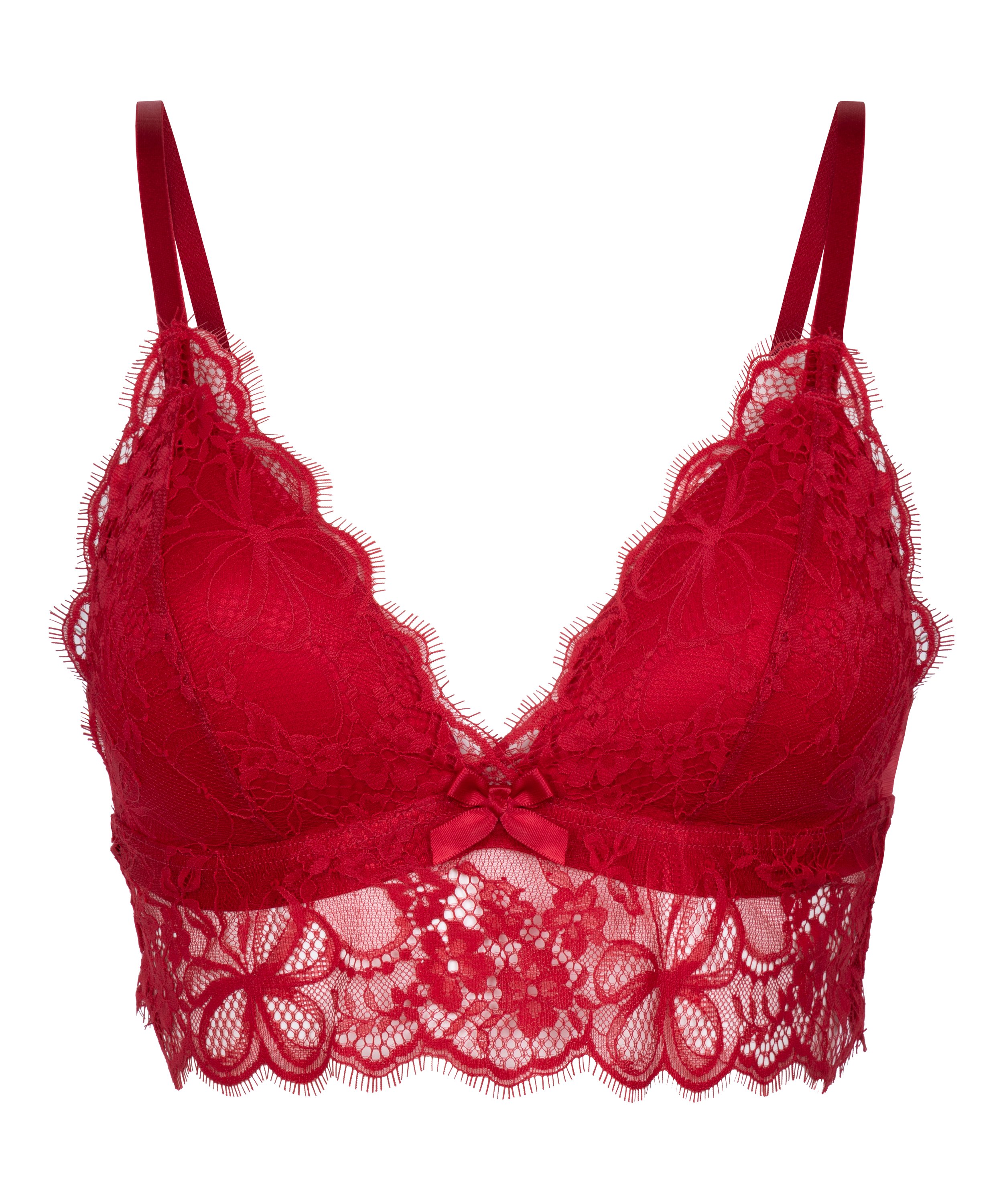 Forelsk deg i komforten og sjarmen til denne helblonde triangel-braletten, designet for en myk, romantisk følelse. Med lett polstring for myk form og uten bøyle for en avslappet passform. Den delikate blonder og den livlige røde fargen gjør den perfekt for festlige øyeblikk eller hverdagslig søthet. Justerbare stropper sikrer en personlig passform. Et flørtende must-have for undertøyskolleksjonen din!