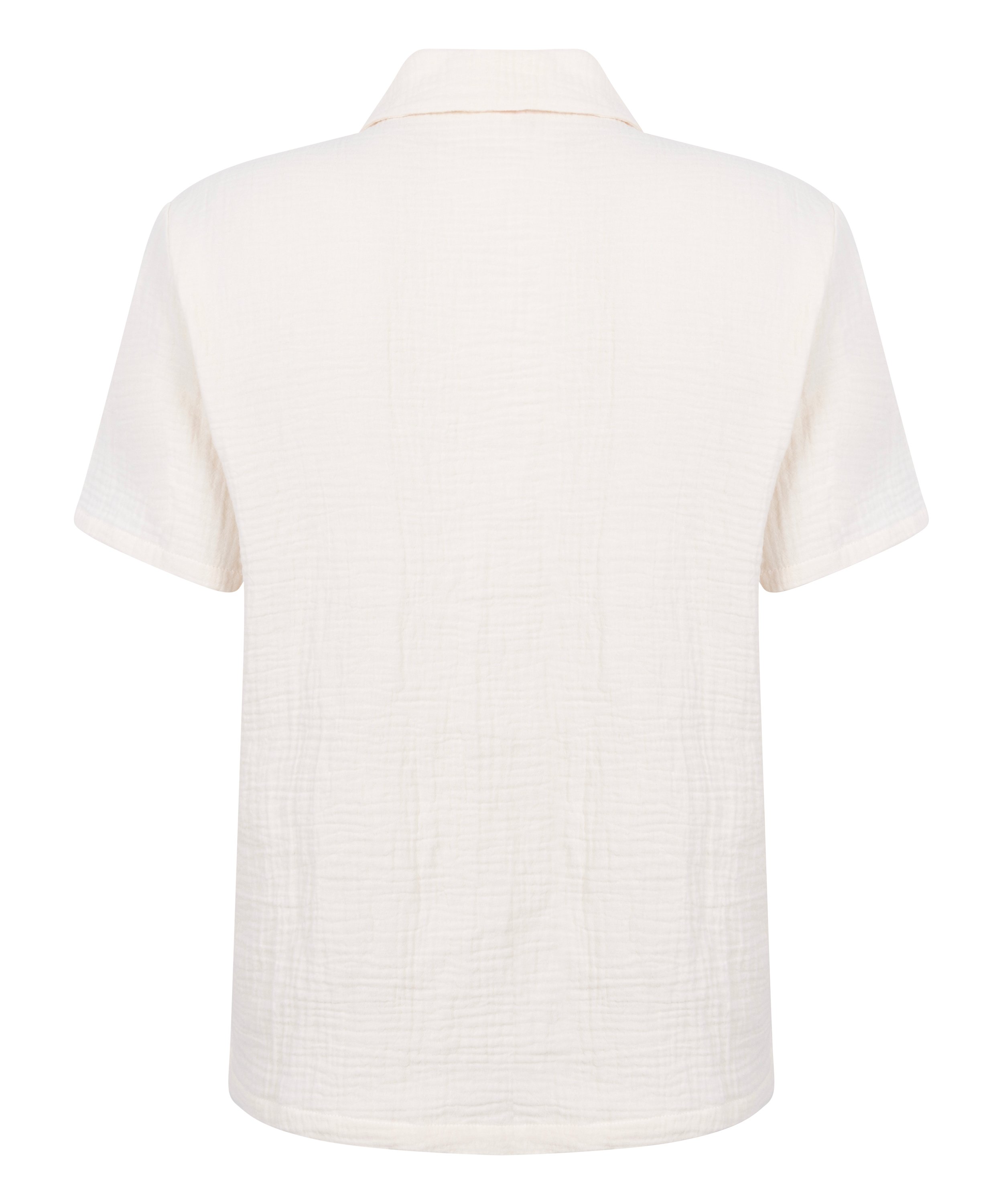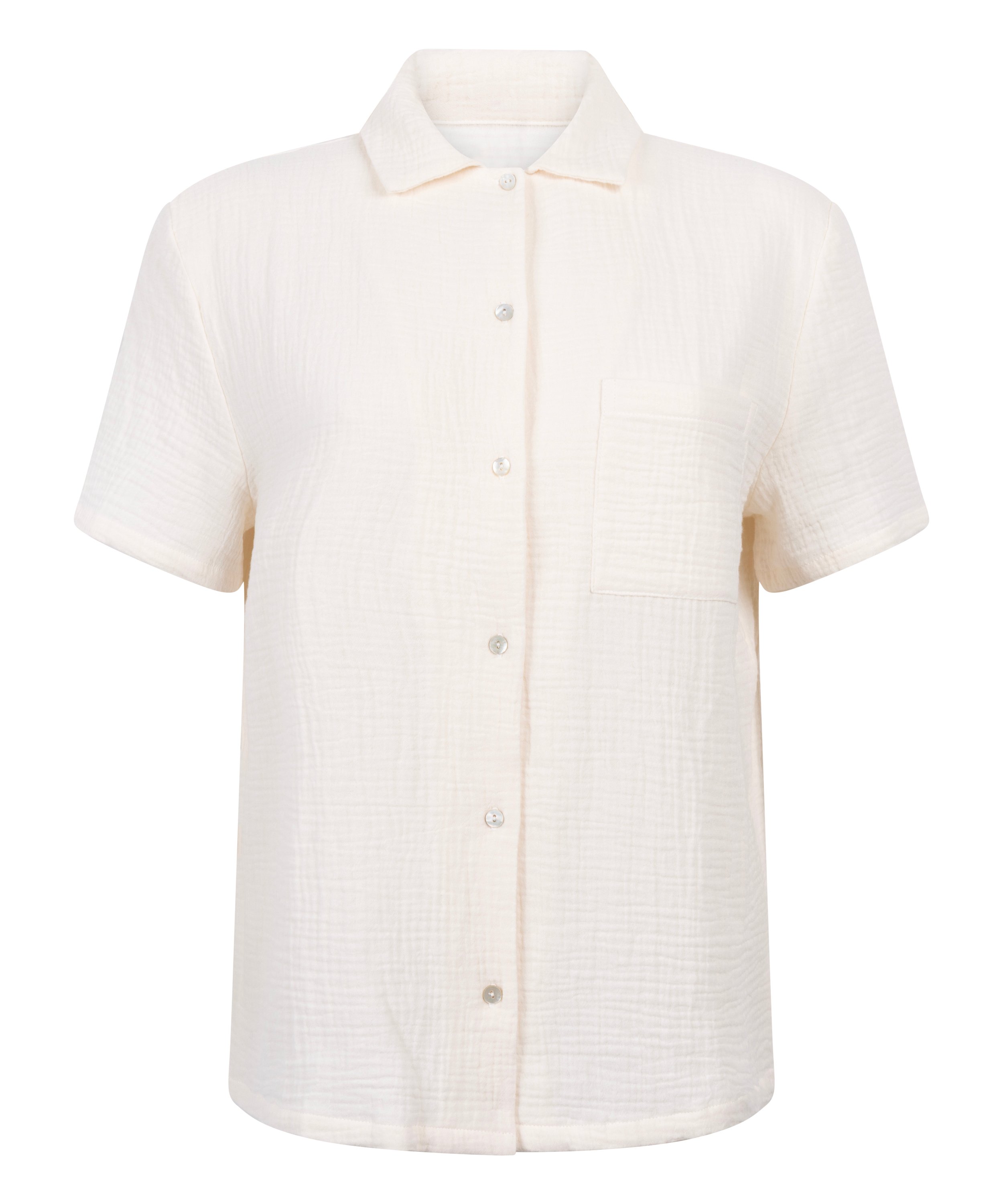 Føl deg komfortabel i denne klassiske pyjamastoppen med knappedetaljer foran. Den er laget av et lett og pustende materiale, perfekt for varme sommerkvelder. Fullfør looken med de matchende buksene.