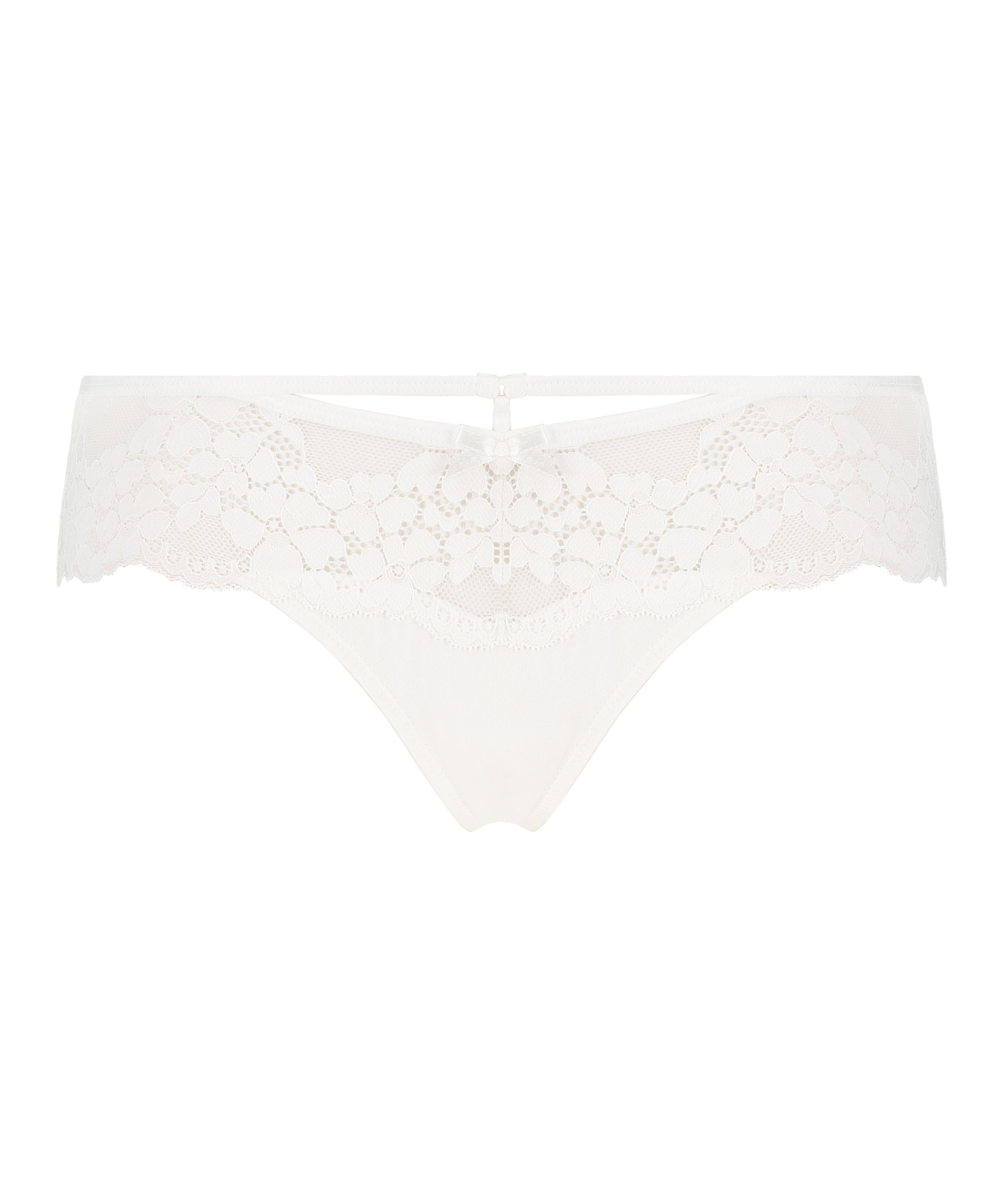 This super sexy thong is finished with lace at the top and strapping details. A small bow adds a finishing touch.