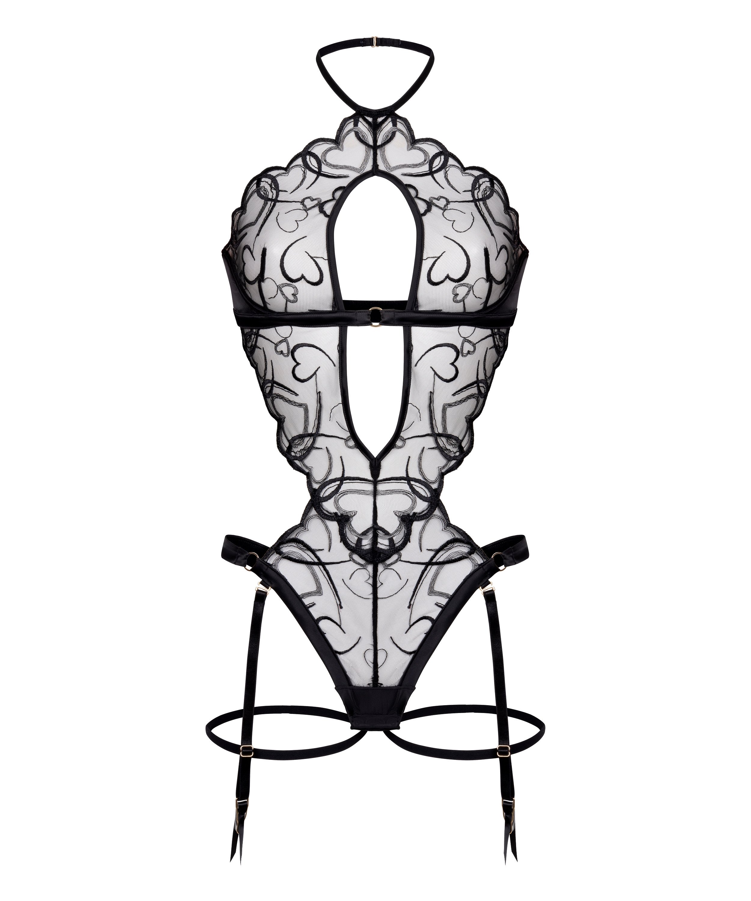 Trå inn i rampelyset med denne iøynefallende bodyen fra vår eksklusive Private Collection. Designet for å fange oppmerksomheten, med dristige utskjæringer og provoserende stropper som fremhever og understreker silhuetten din. Dette plagget er laget av en sensuell blanding av gjennomsiktig mesh og delikat blonder, og kombinerer dristig design med raffinert eleganse.