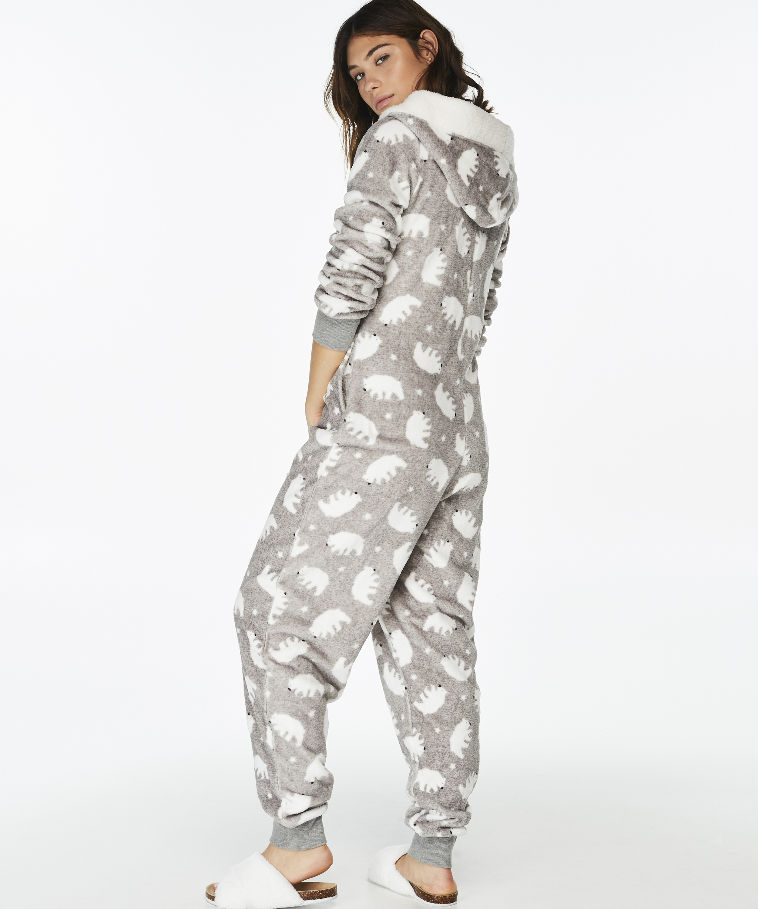 Chill mode on! Relax in this onesie finished with a subtle design and a hood.