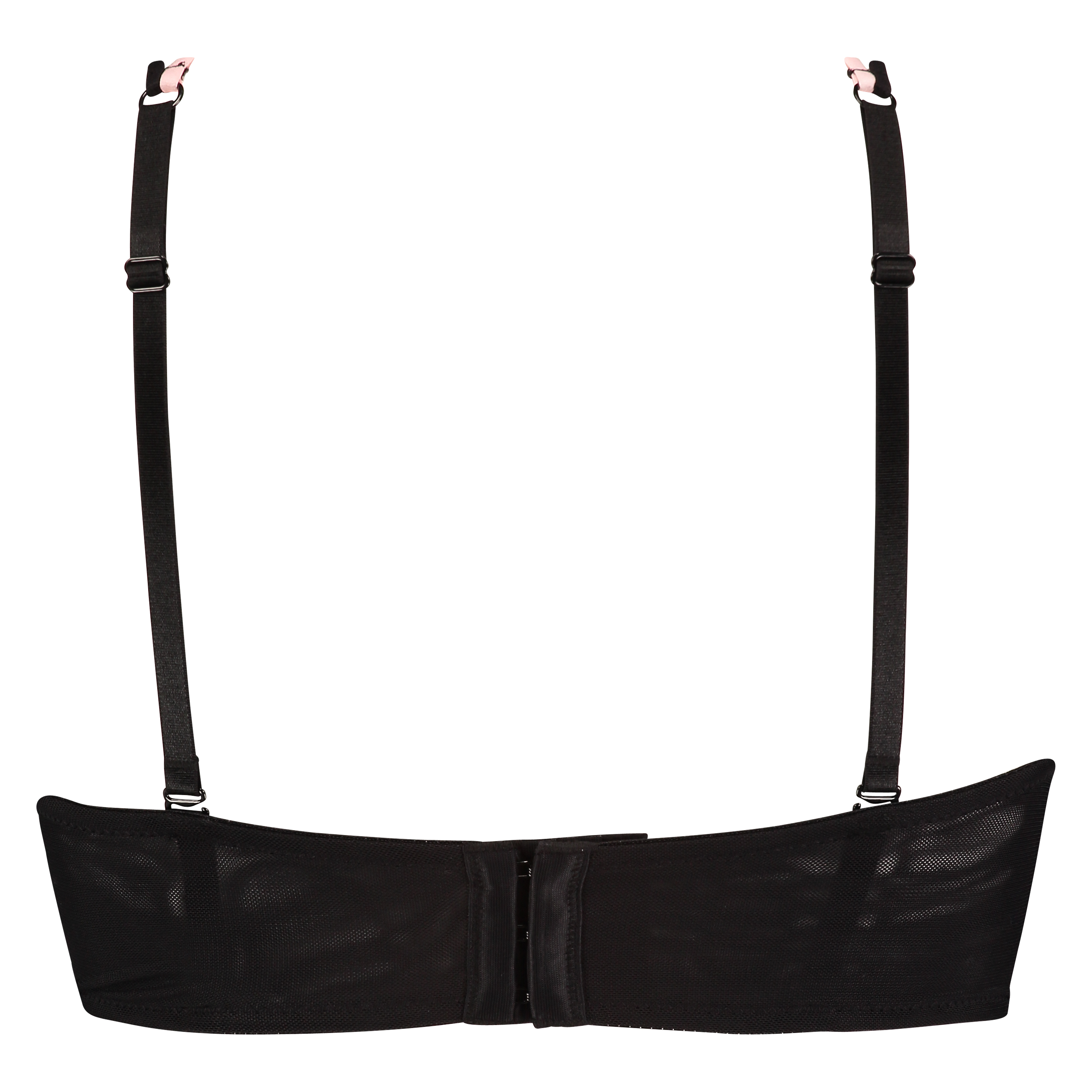 This padded and underwired bra is black with light pink accents. The cups feature cup seams and bows. The bra has an all-over dotted pattern