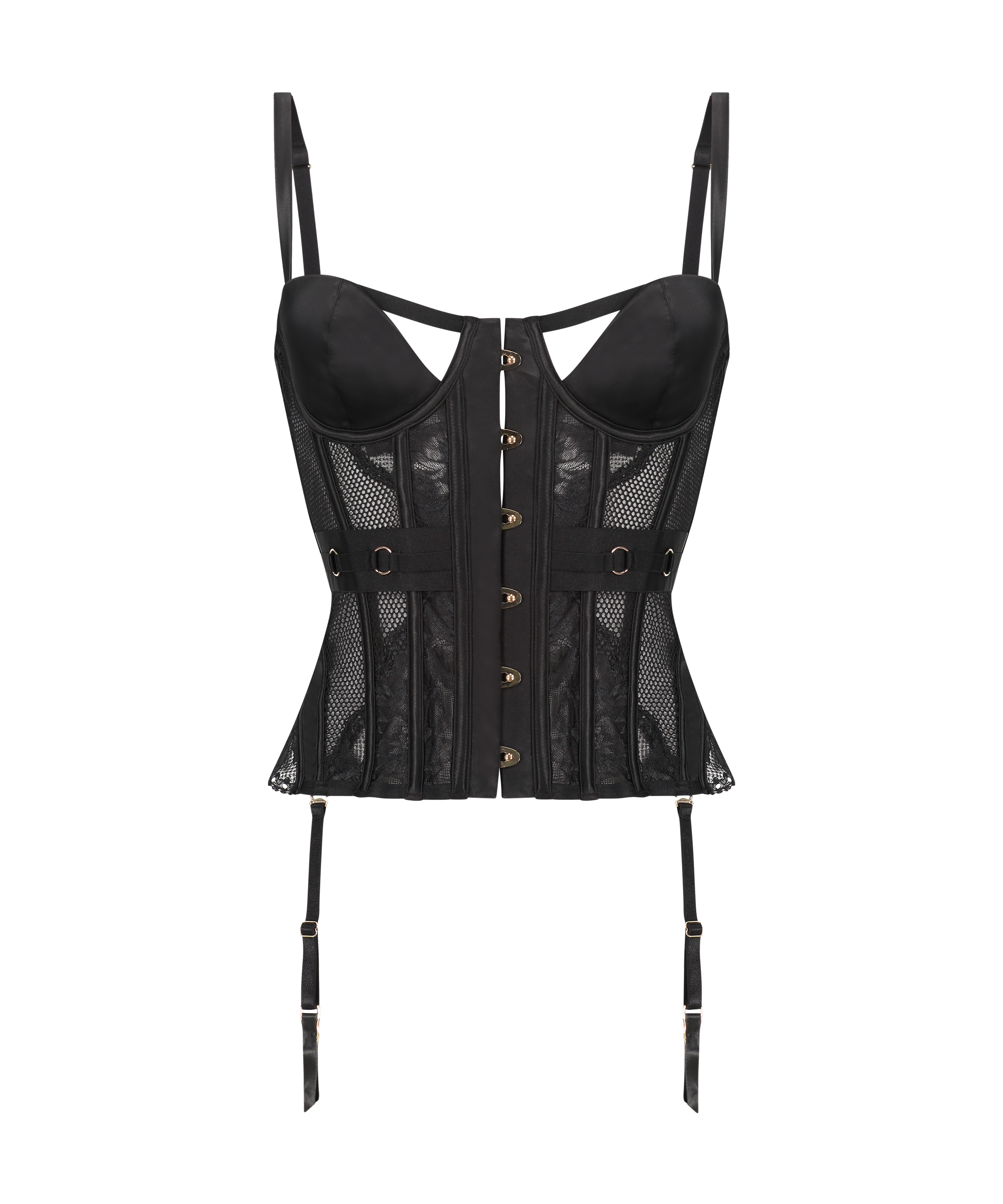Utforsk forføreriskheten din med denne sexy bustieren! Laget av gjennomsiktig fiskenettmateriale og pyntet med en mengde blonder. Skålene med bøyle er laget i et satengmateriale. Den har en sexy lukkemekanisme foran. Spilene foran og bak gjør den komfortabel, og stroppedetaljene rundt livet bidrar til det vakre utseendet. Den kan strammes i ryggen med et snorsystem for å sikre at den sitter perfekt. Finn den matchende trusen og kombiner med strømper for å få et komplett sett!