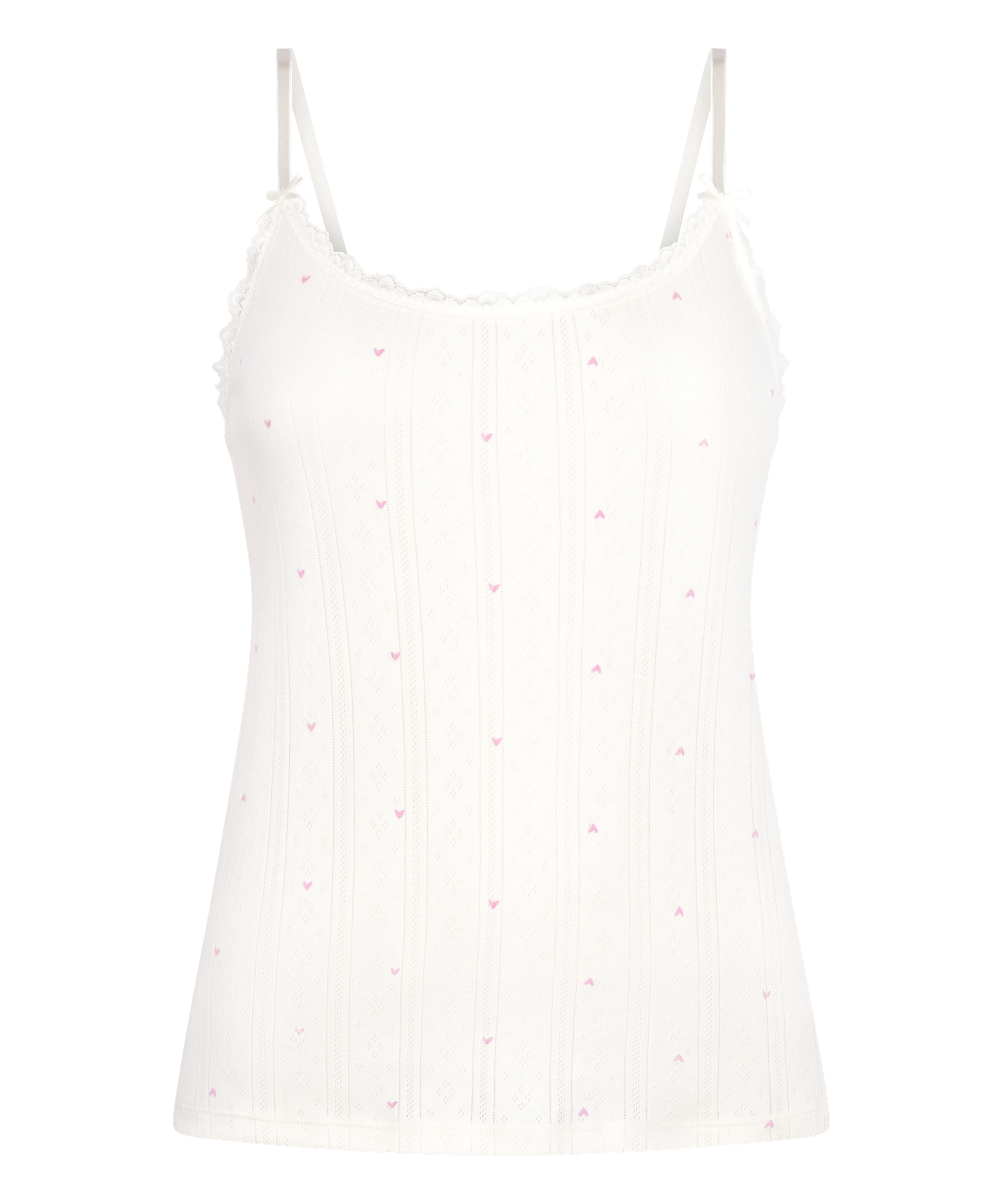 Hvis du er på jakt etter noe søtt og pustende, er denne pointelle-cami-toppen det perfekte valget! Laget av myk bomull med små hjerte-detaljer og delikate stropper, er den perfekt for varme netter eller under din favorittcardigan... et must-have for din koselige garderobe. Styl den med matchende shorts eller bukser for å fullføre looken!