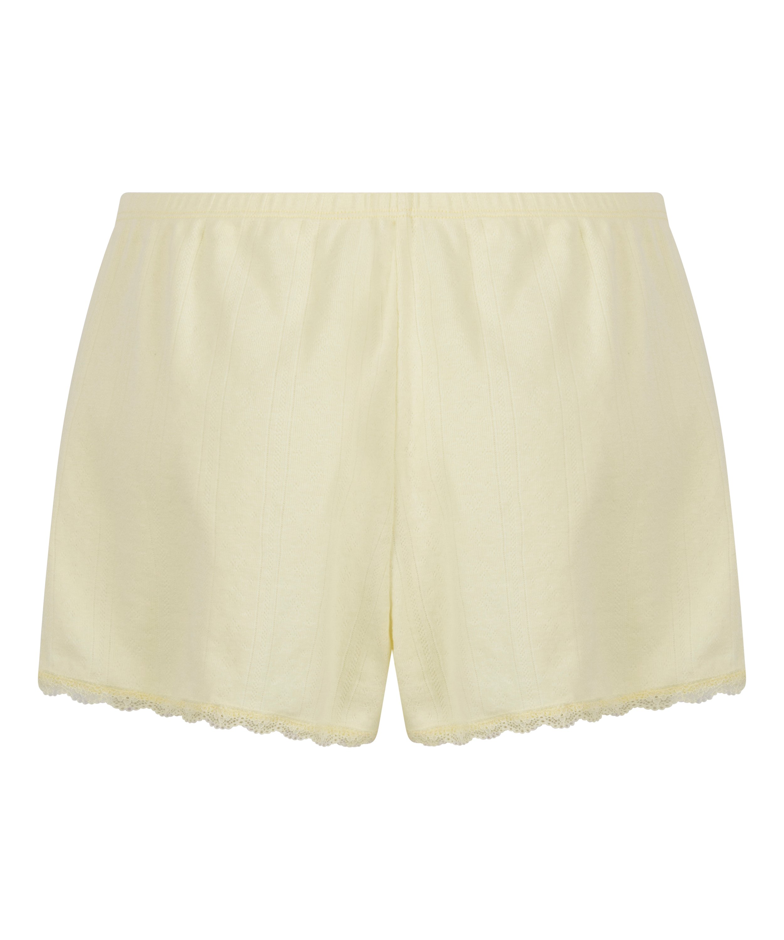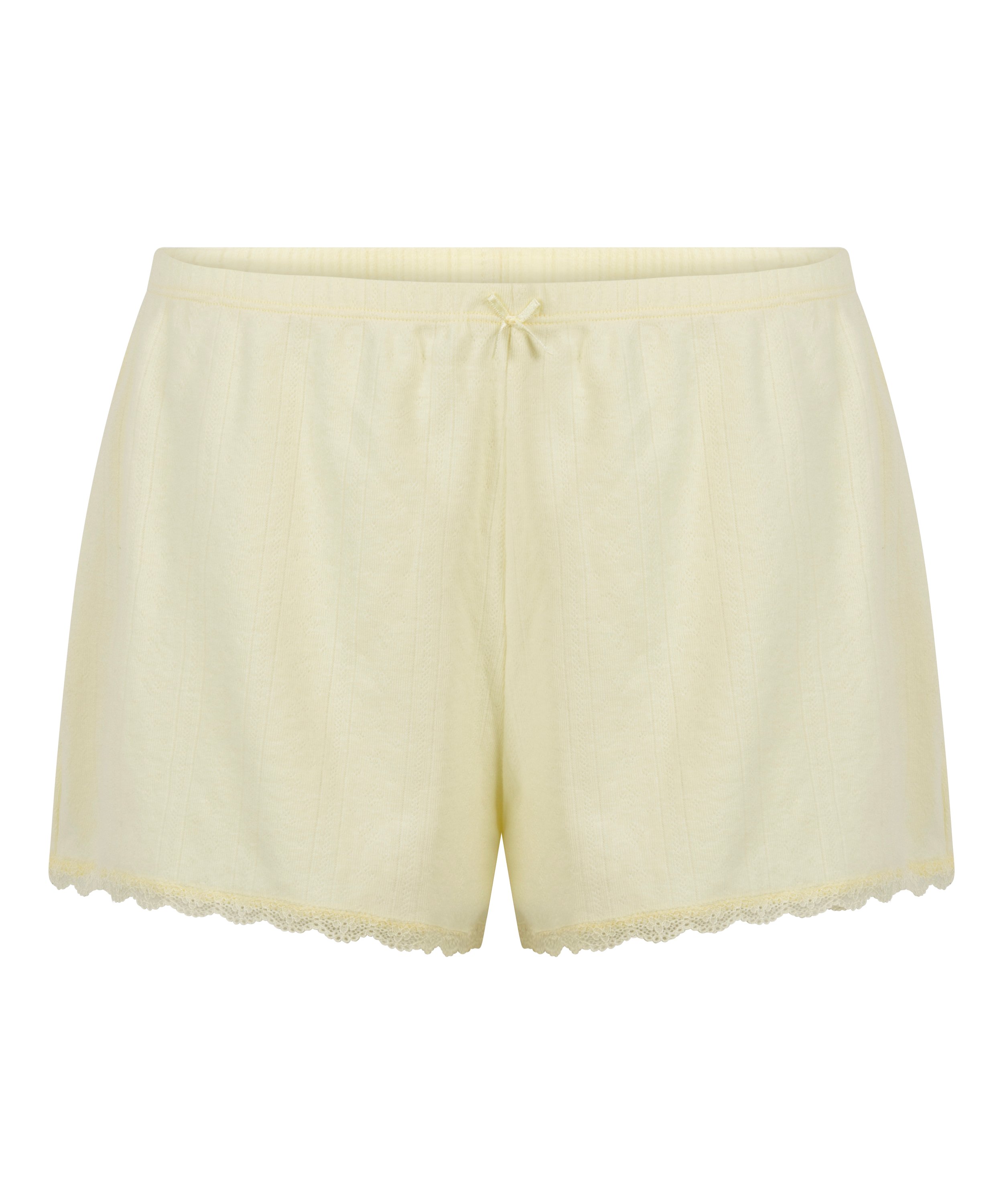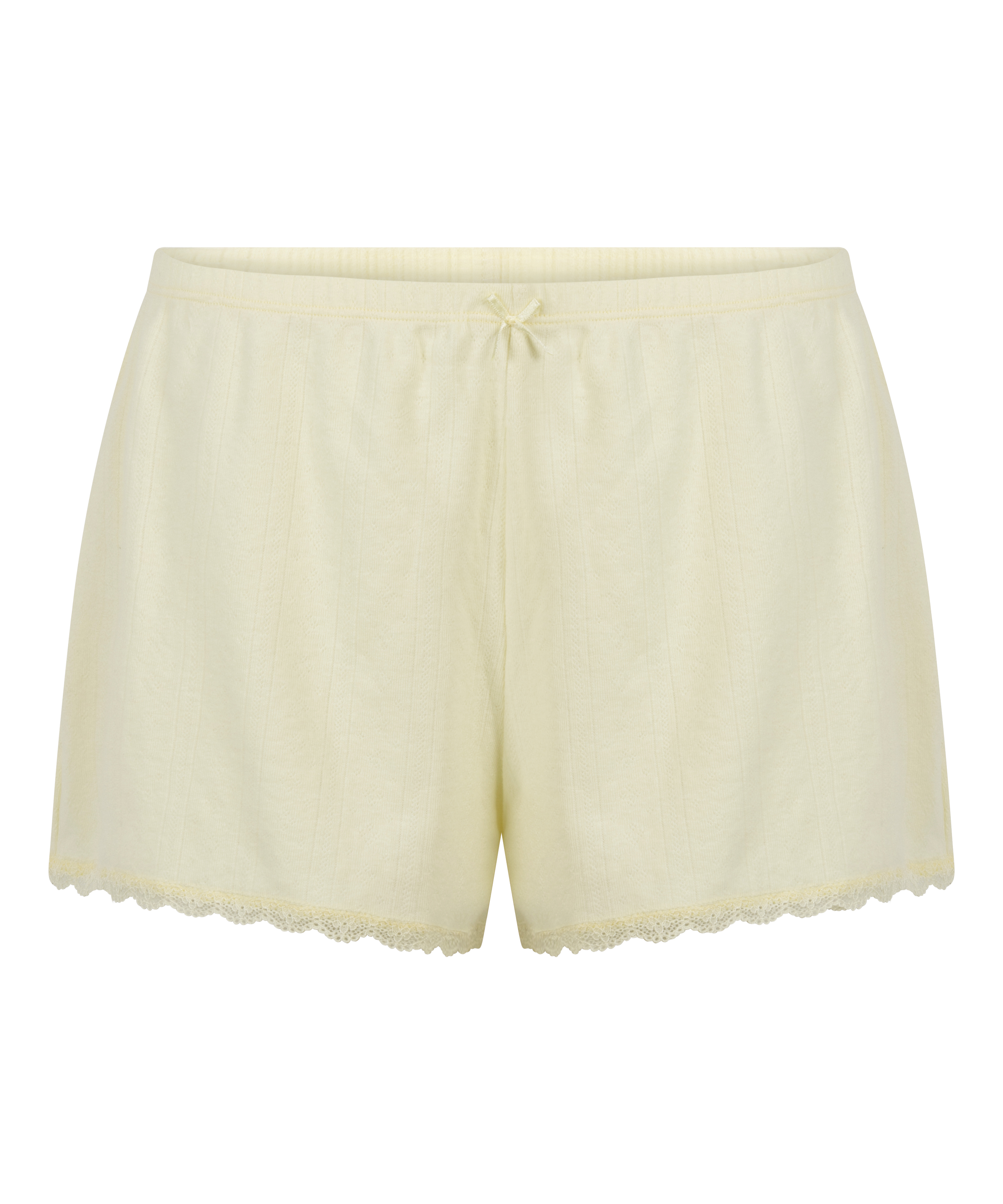 Hold deg komfortabel og stilig med shortsene våre. Disse shortsen er laget av mykt pointelle-stoff og har et strukturert mønster som gir et ekstra touch til fritidsklærne dine. Snøredetaljer løfter looken, mens den elastiske linningen sørger for en sikker og behagelig passform.