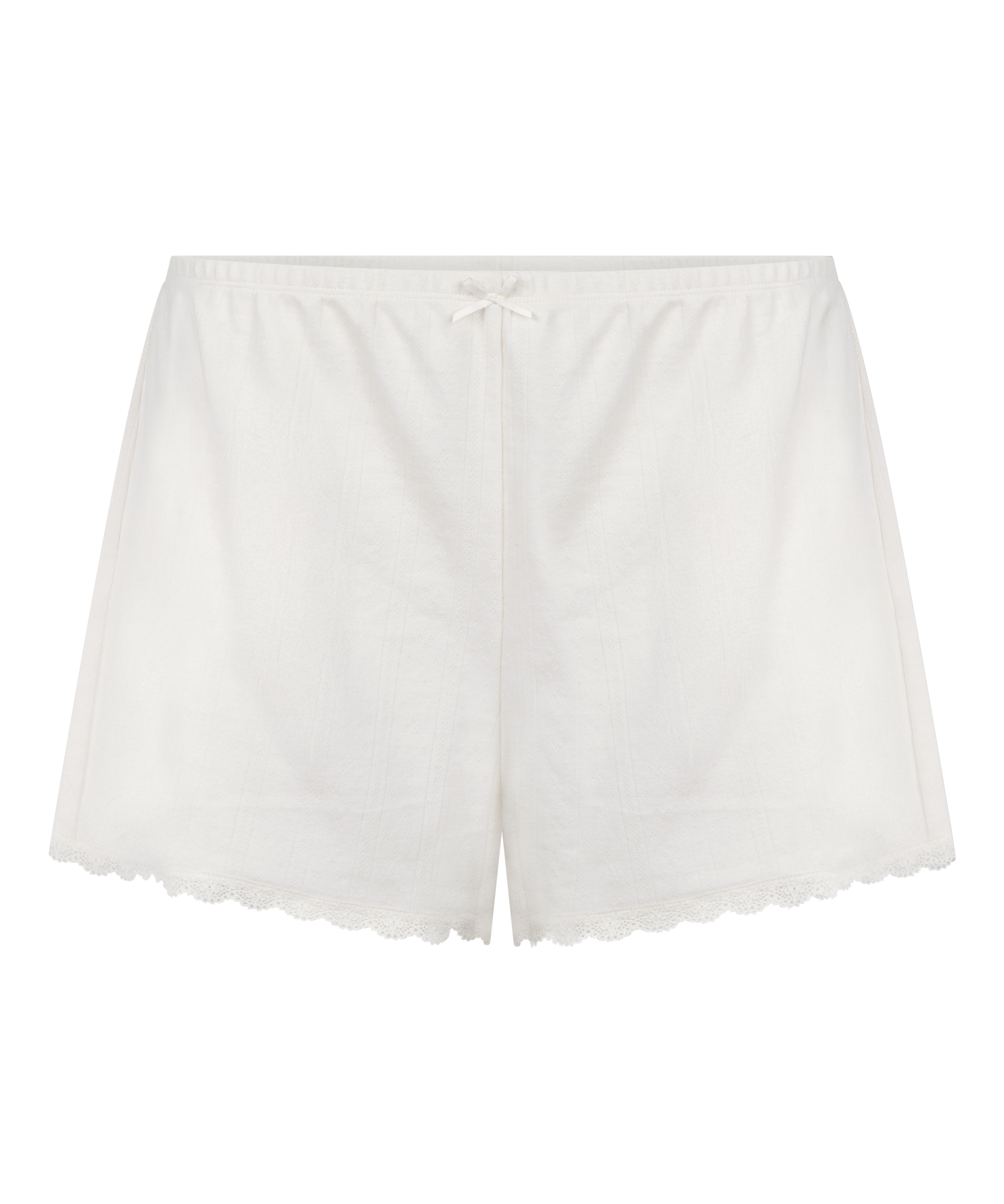 Hold deg komfortabel og stilig med shortsene våre. Disse shortsen er laget av mykt pointelle-stoff og har et strukturert mønster som gir et ekstra touch til fritidsklærne dine. Snøredetaljer løfter looken, mens den elastiske linningen sørger for en sikker og behagelig passform.