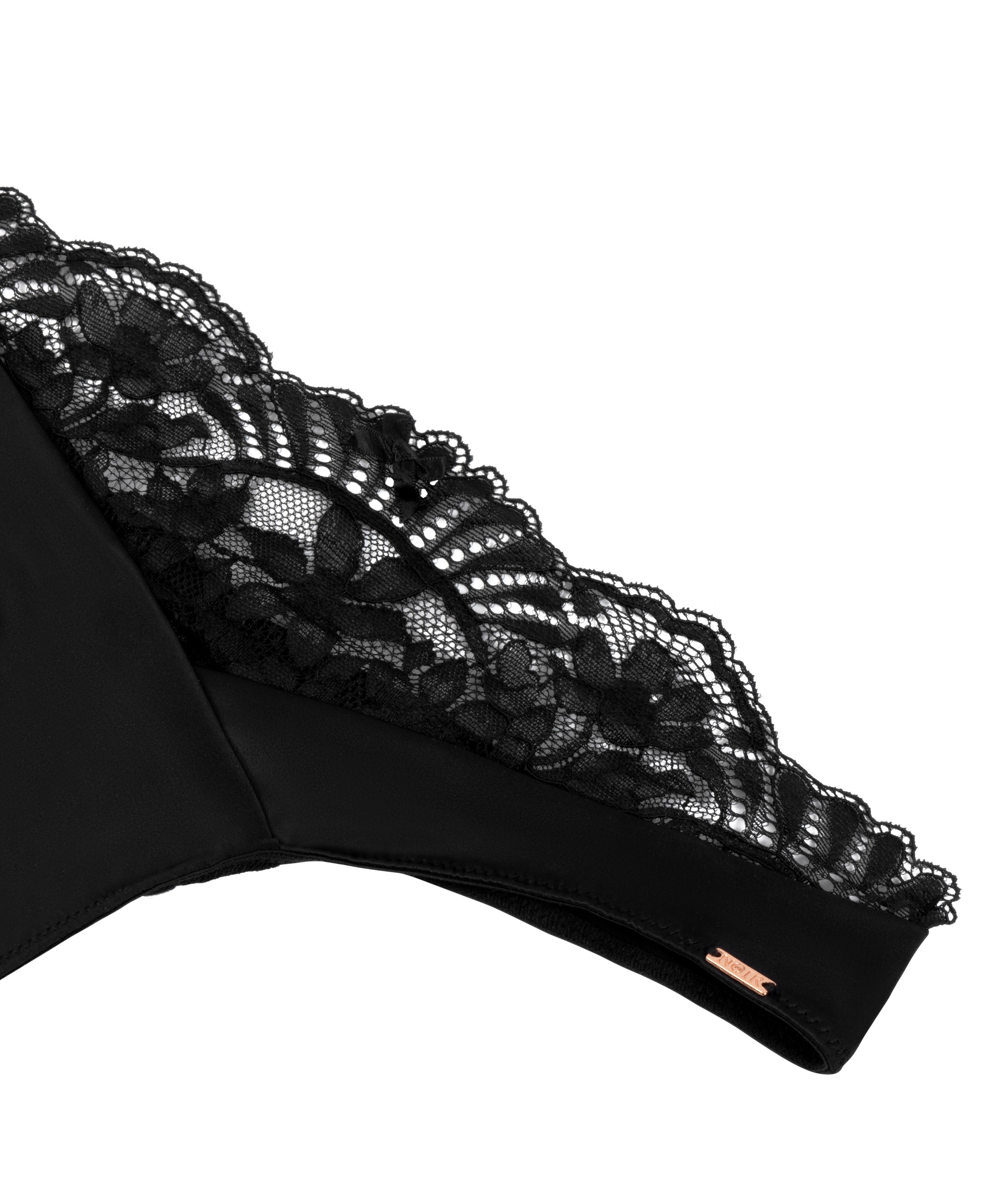 Utseendet og følelsen som av sateng gjør dette til en herlig thong. Med blondepynt. En del av den utsøkte Noir-kolleksjonen.