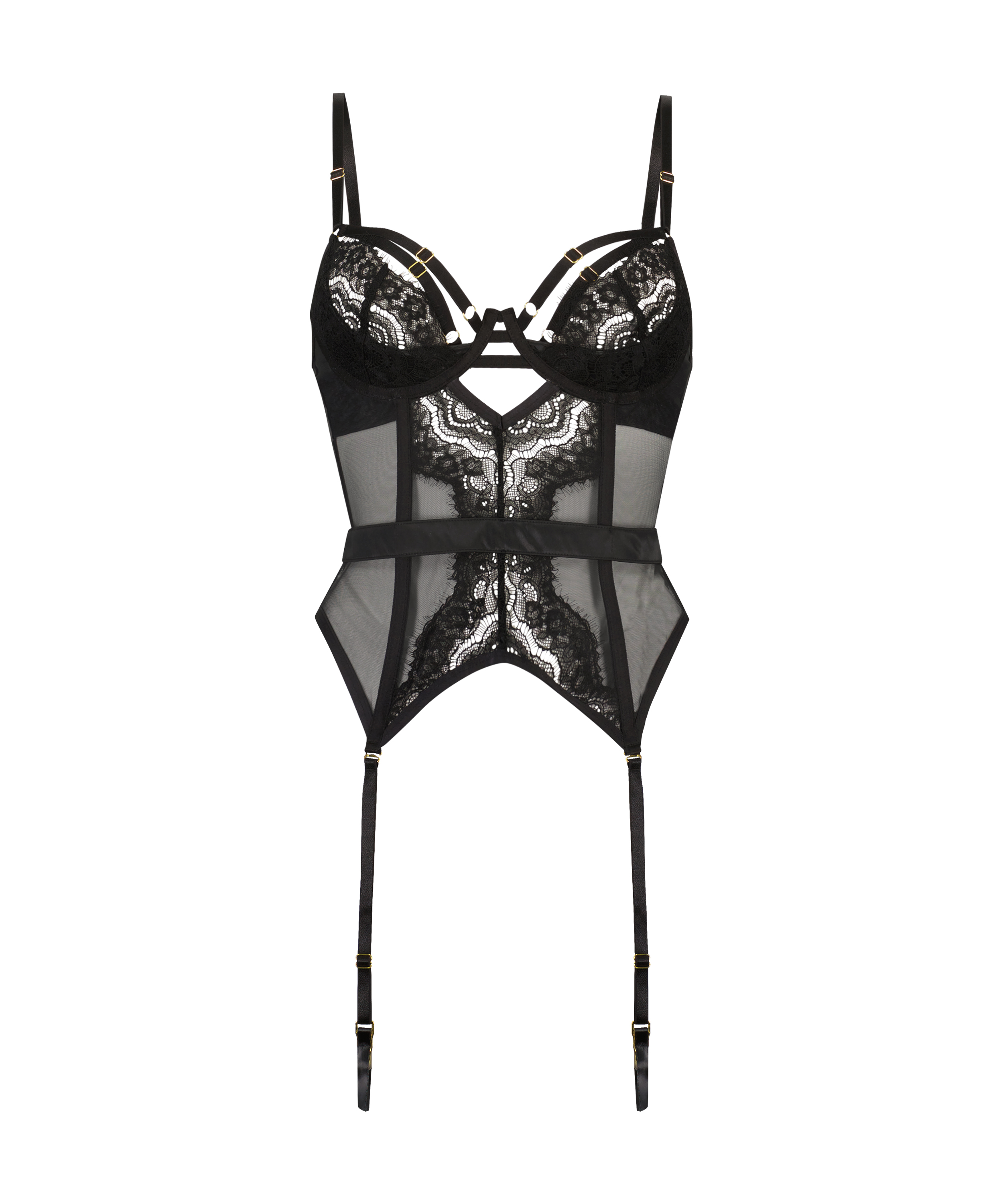 I denne bustieren føler du deg uimotståelig sexy! Bustieren er vakkert utført med blonder og mesh. Bodyen har strømpeholdere, slik at du bruke den på en sexy måte med favorittstrømpene dine! Kombiner med matchende truse for å få en gjennomført look. En del av Private-kolleksjonen.