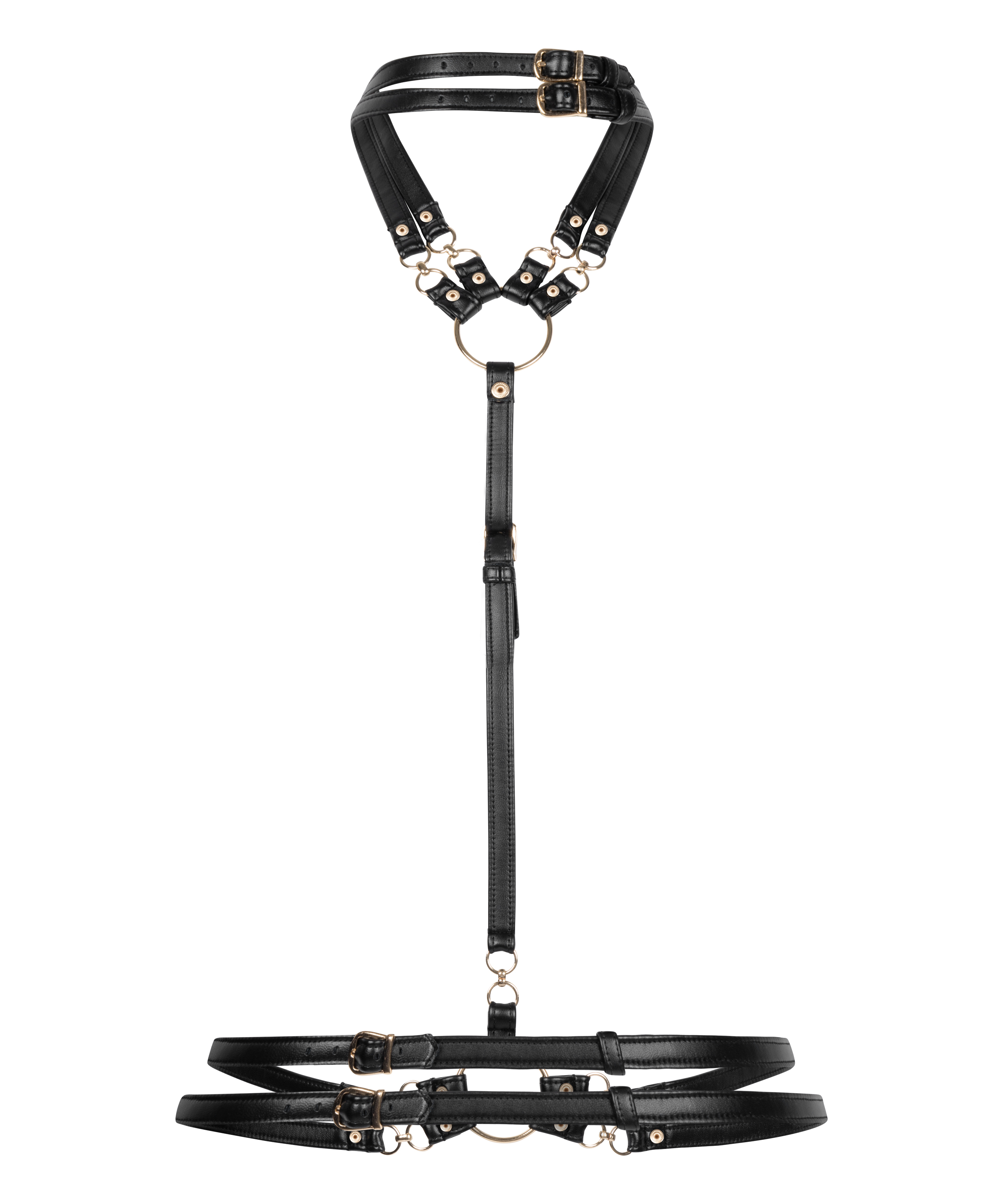 Krydre tilværelsen med denne harness i imitert skinn. Med masse metaldetaljer og justerbare spenner som gjør at det passer perfekt.