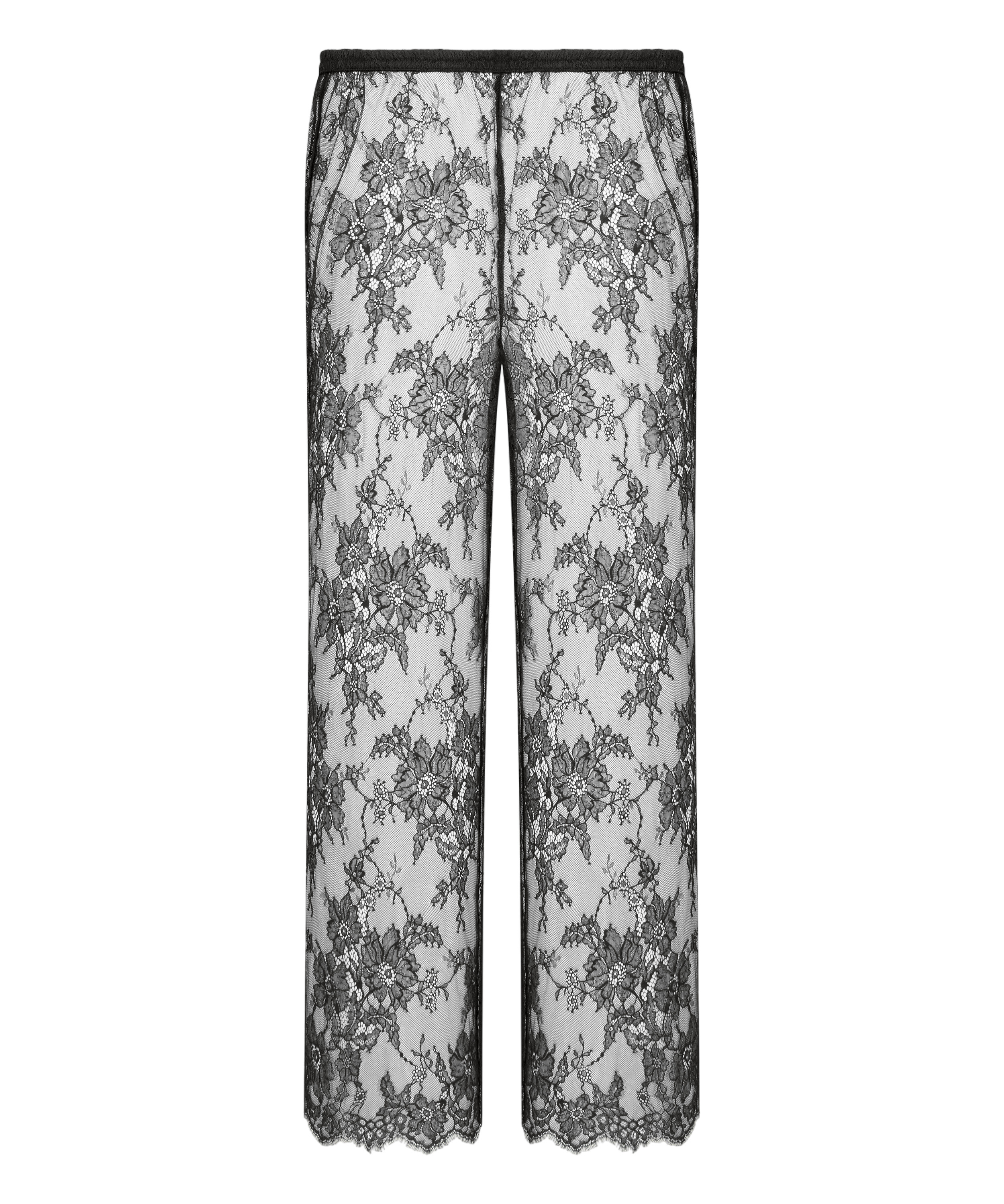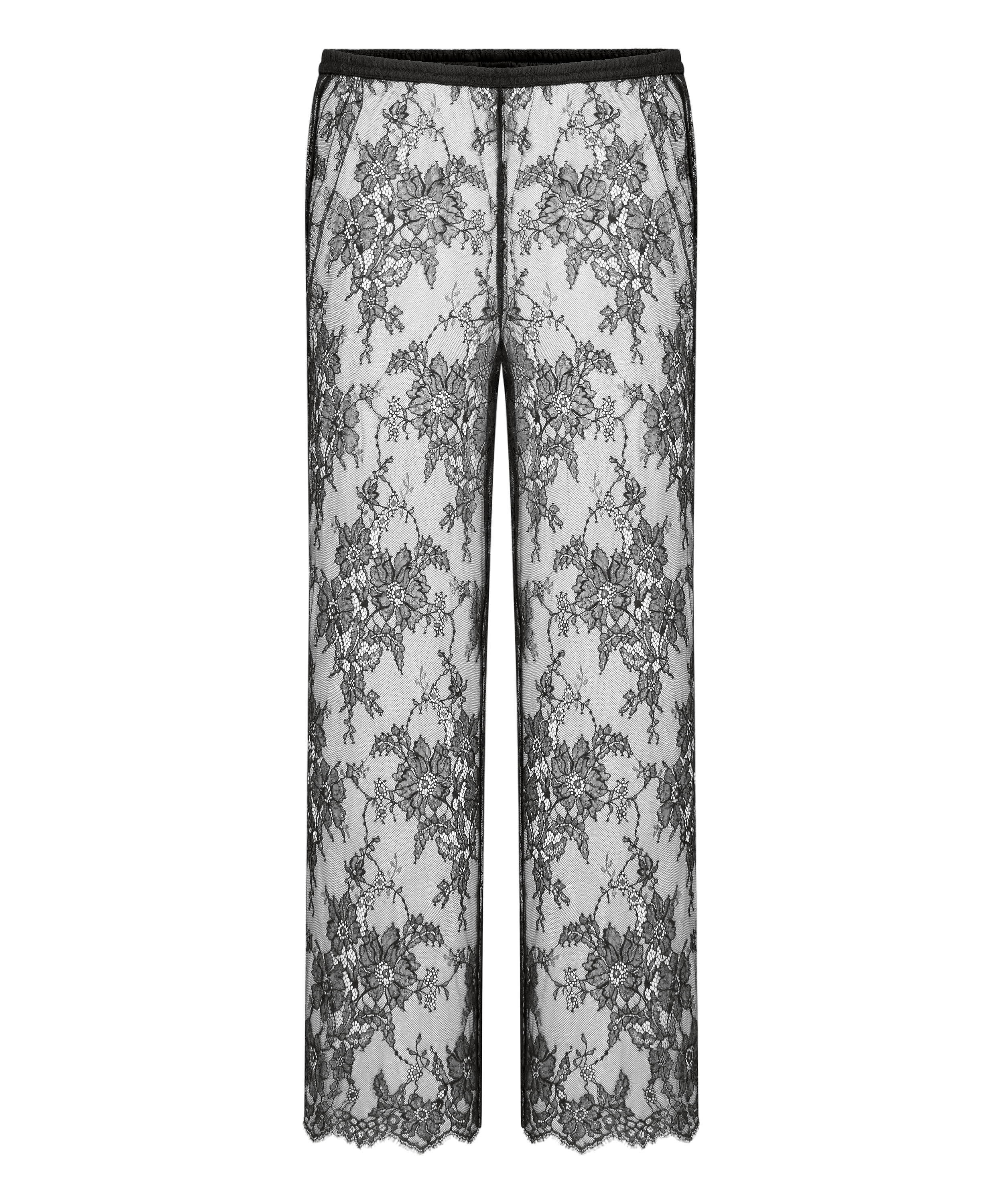 Oppgrader garderoben din med disse elegante blonderbuksene, designet for å kombinere komfort med en markant stil. De er laget av blomstret blonder over hele overflaten, og har en delikat tekstur og en semi-transparent finish som er perfekt for lag-på-lag-stilen eller til festantrekk. Den elastiske linningen sørger for en behagelig og fleksibel passform, mens den vide benformen gir elegante bevegelser ved hvert skritt. Kombiner med den matchende toppen for en gjennomført look.