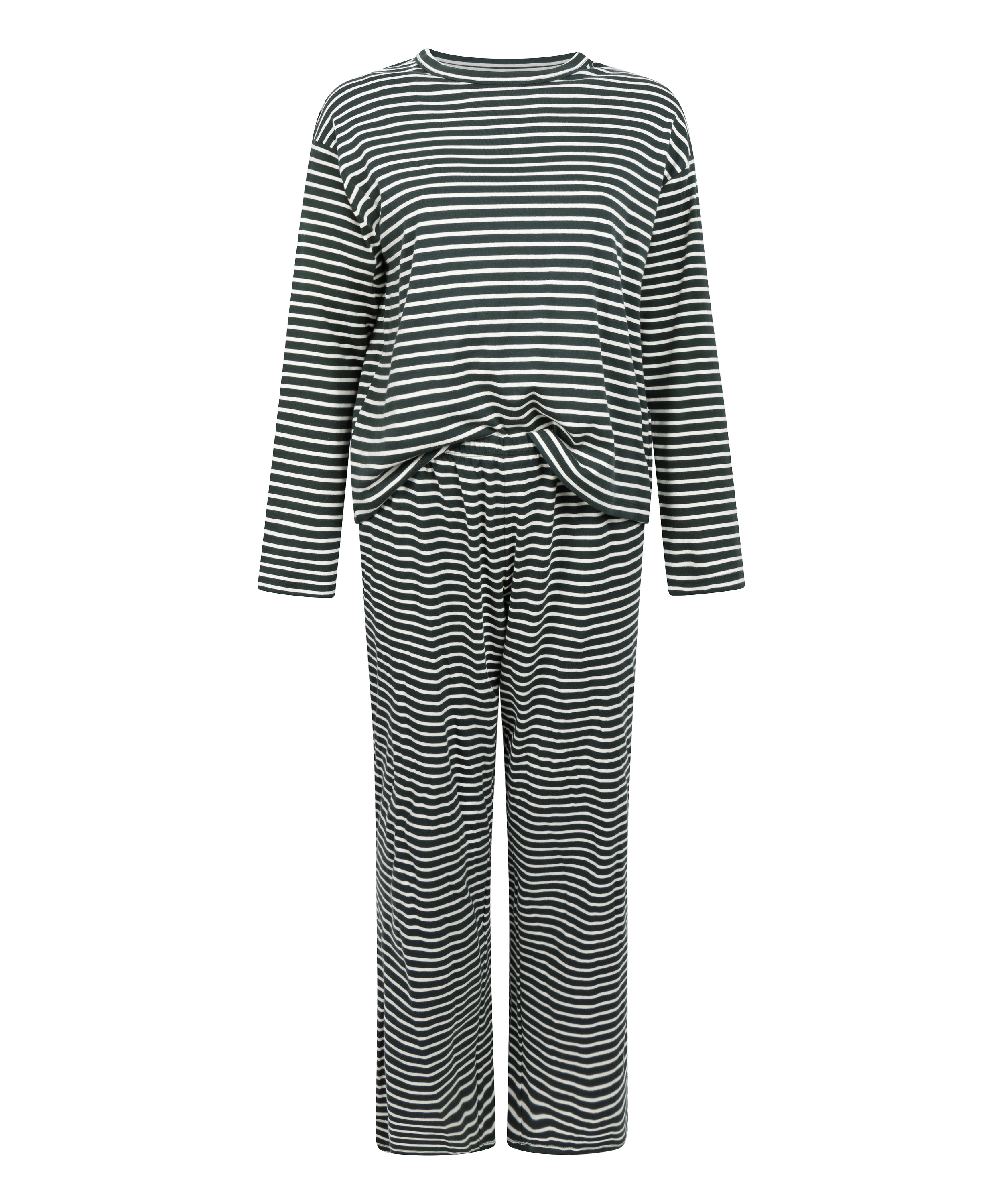 Slapp av i komfort med SoftEase-pyjamasettet, laget av pustende bomullsjersey som føles mykt mot huden. Dette tidløse todelte settet består av en langermet topp med rund hals og matchende bukser i full lengde – perfekt for kjøligere kvelder eller avslappede morgener. Kombiner med dine favorittøfler for en komplett look!