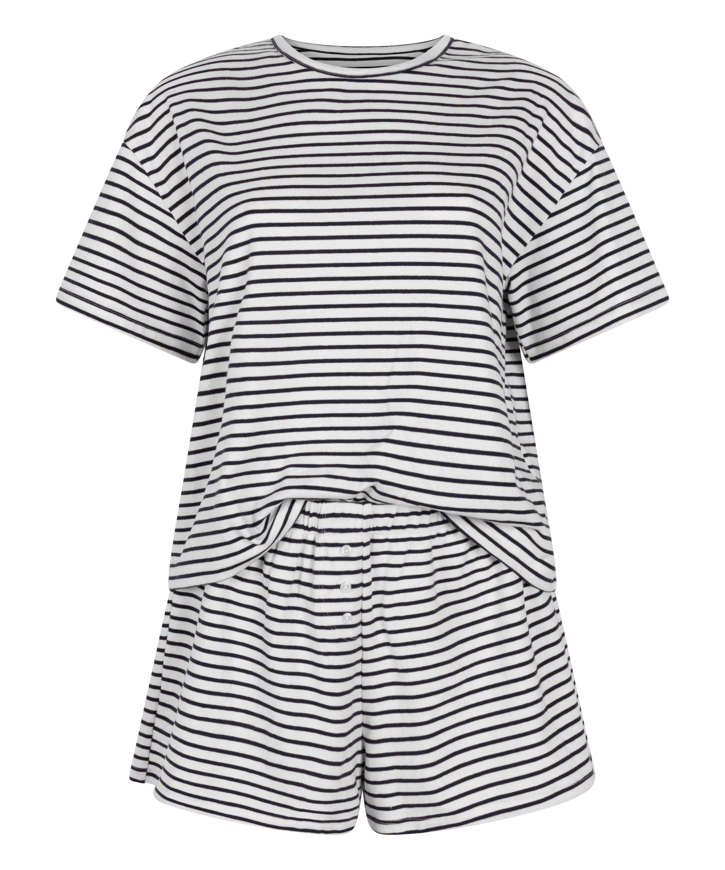 Slapp av i komfort og stil med dette koselige pyjamasettet. Inneholder en shorts og en matchende T-skjorte med korte ermer. Laget av jerseystoff og designet for å bevege seg med deg – perfekt for en god natts søvn eller avslapning. Den avslappede passformen gjør det til en favoritt på varme netter – et must-have i nattøysskuffen din.