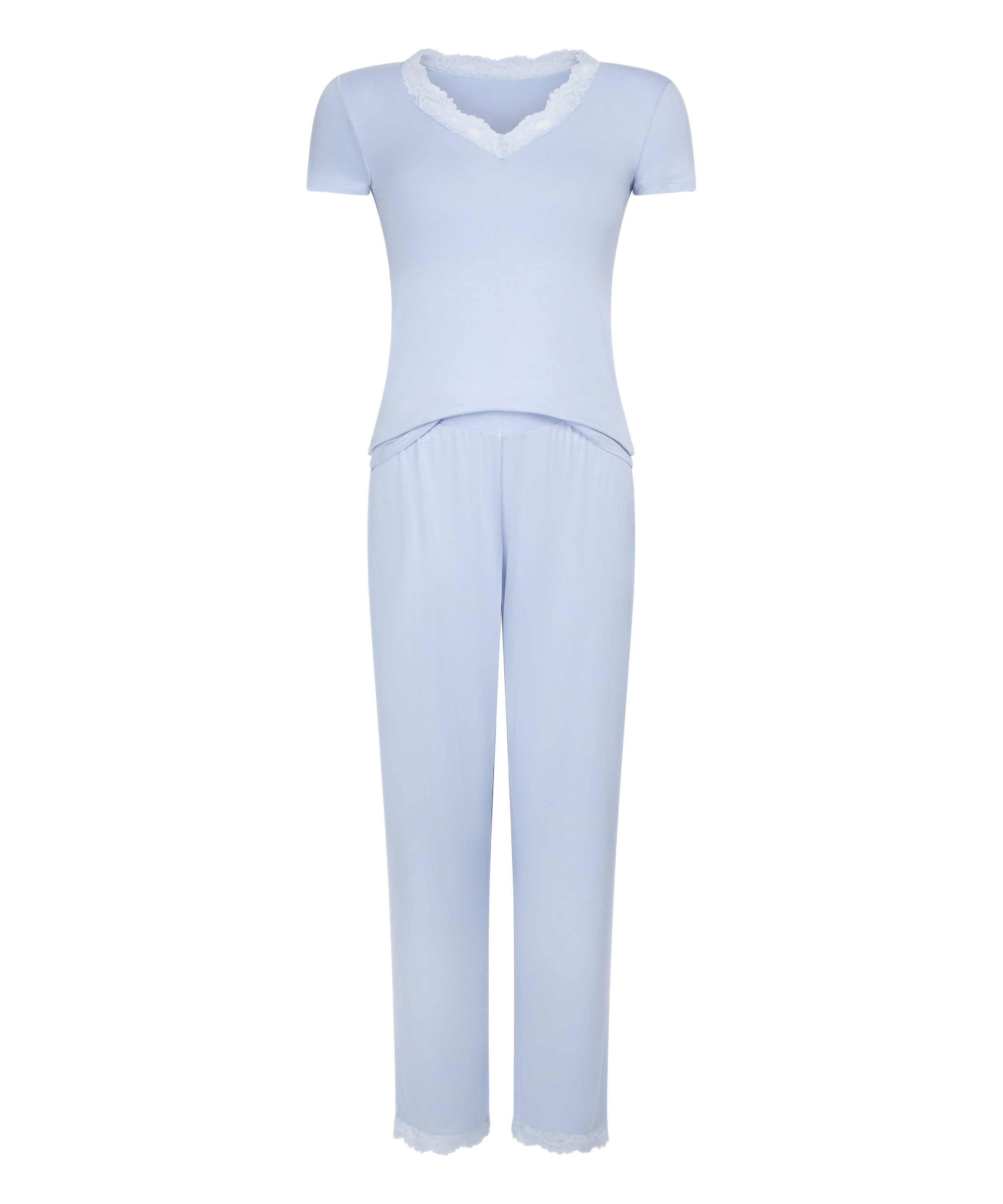 Slapp av med stil i vårt pyjamasett, designet for ultimat komfort og eleganse. Dette todelte settet har en myk, pustende topp med korte ermer og en flatterende V-hals pyntet med blonder. Sammen med lange, romslige bukser for en avslappet passform og med blondedetaljer nederst. Settet er perfekt for å slappe av i eller for en god natts søvn.
