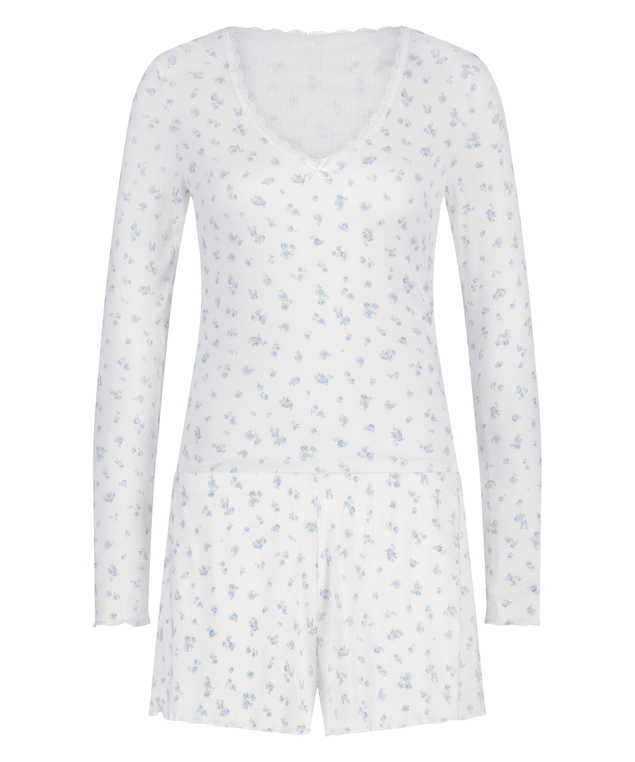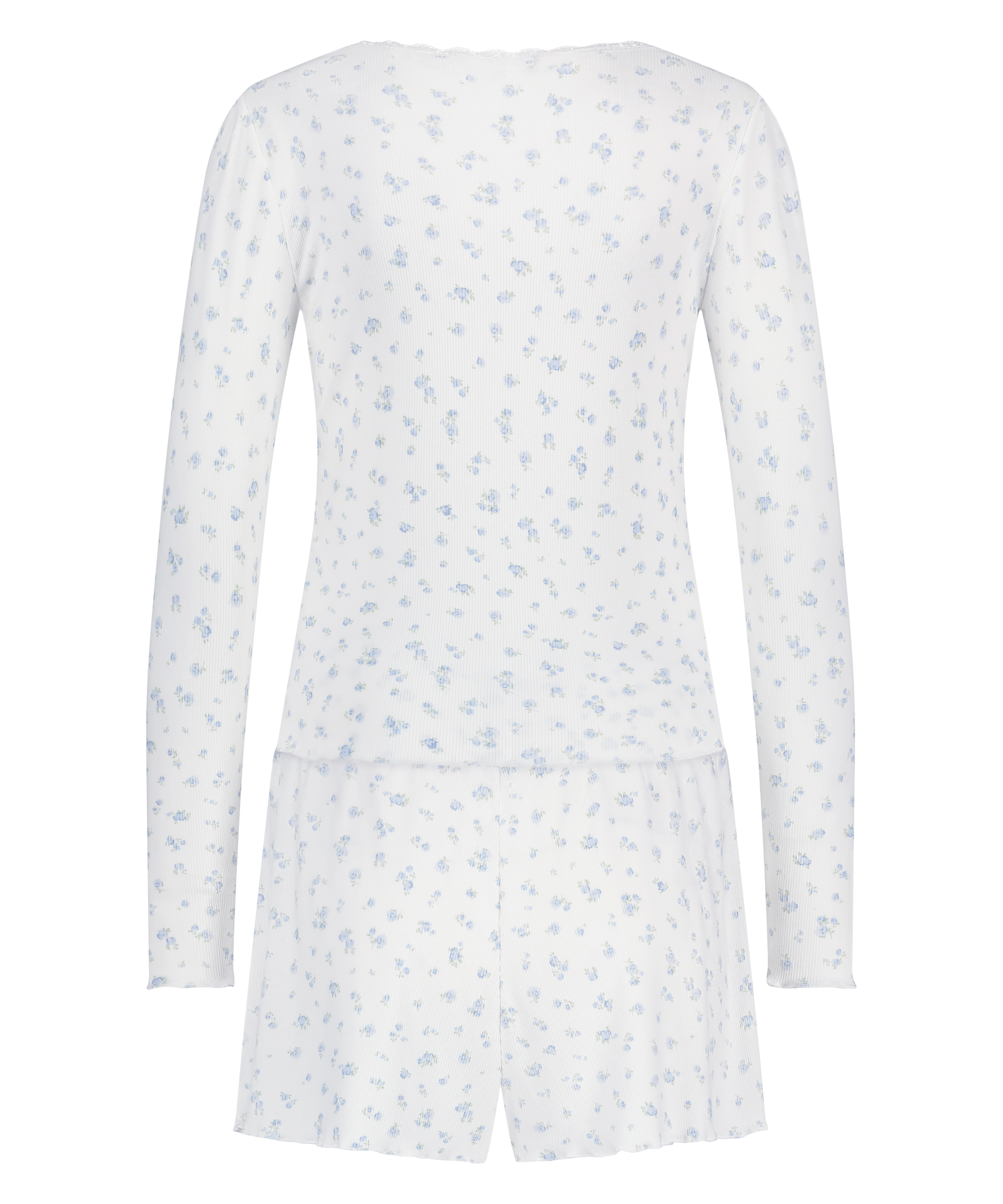 Hold deg varm og stilig i vårt pyjamasett, en perfekt blanding av komfort og sjarm. Dette todelte settet inkluderer en myk, ribbestrikket, langermet topp og matchende shorts. Toppen har blondedetaljer i halsen, som gir en feminin touch til det lune designet. Dette pyjamassettet er ideelt for å slappe av eller sove i.