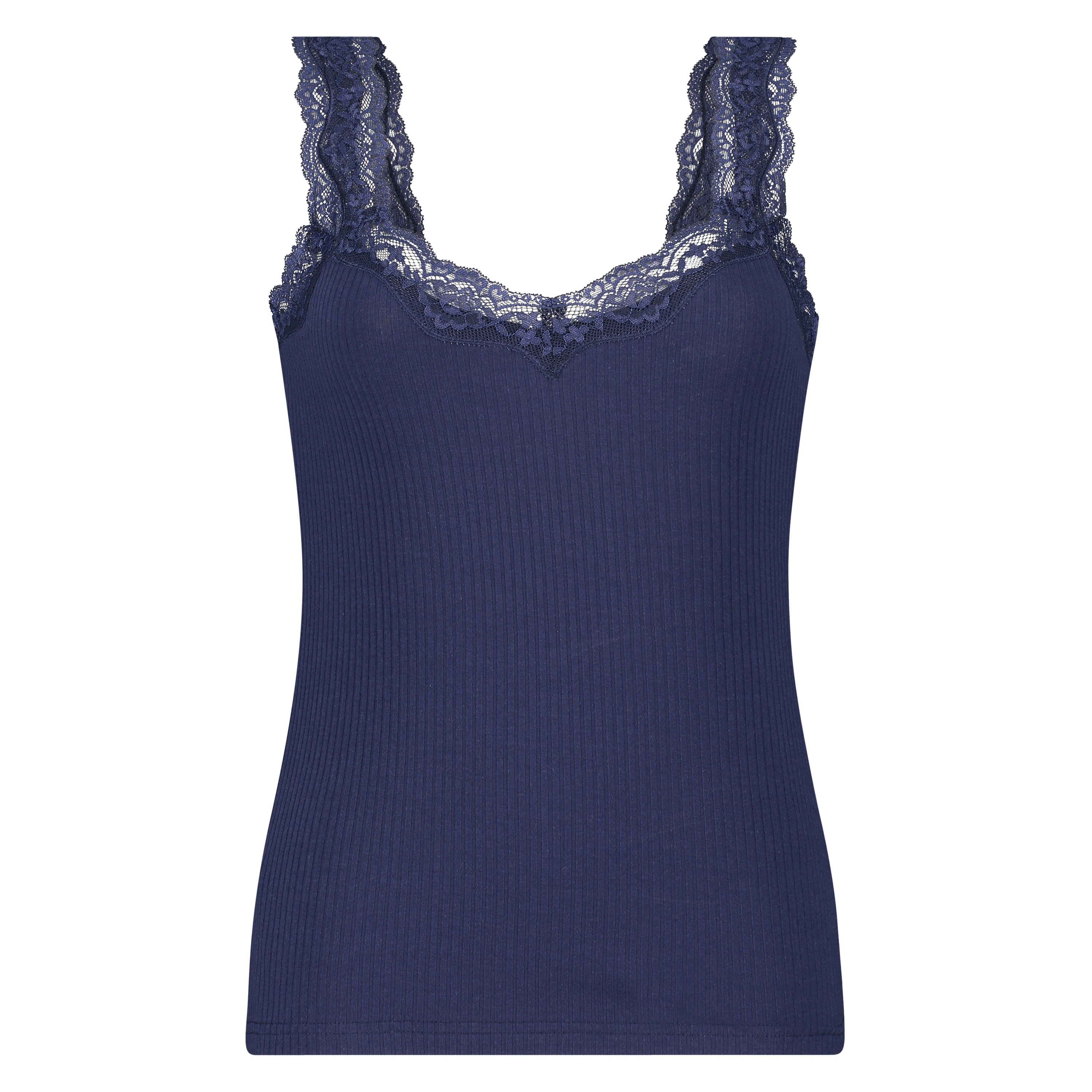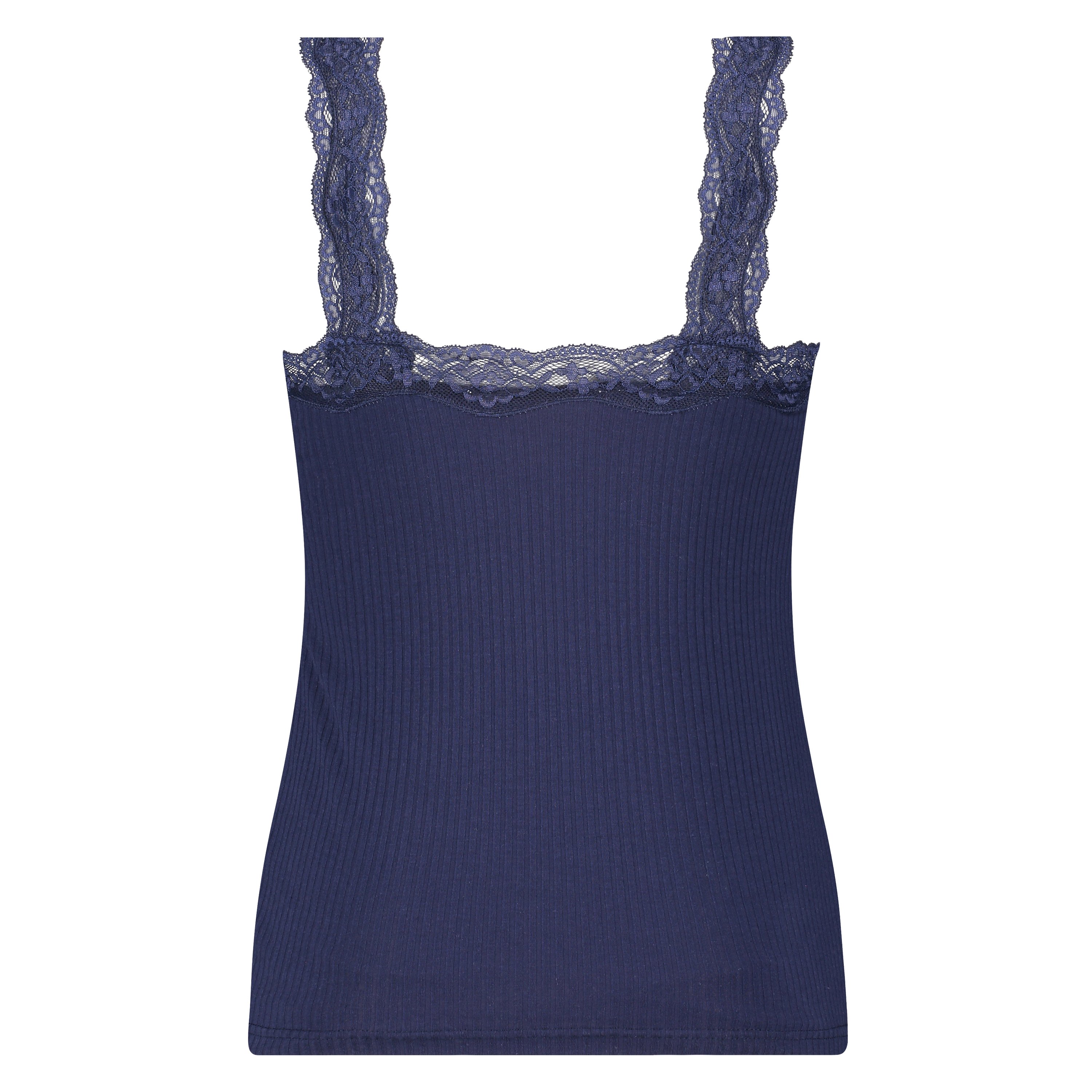 Denne camien er fremstilt med et ribbemønster. Øverst er den forseggjort med blondedetaljer. Kombiner med en av de matchende artiklene.
