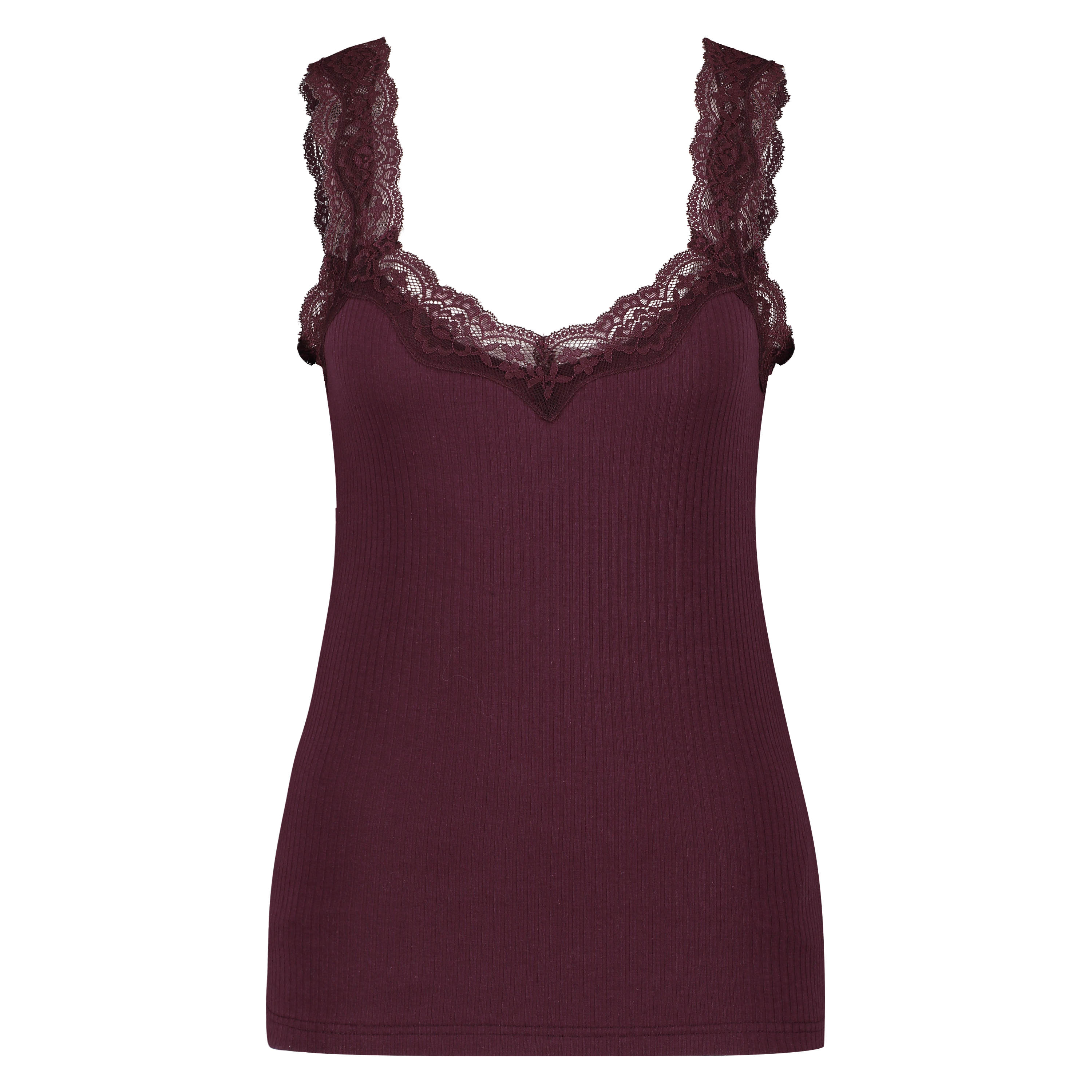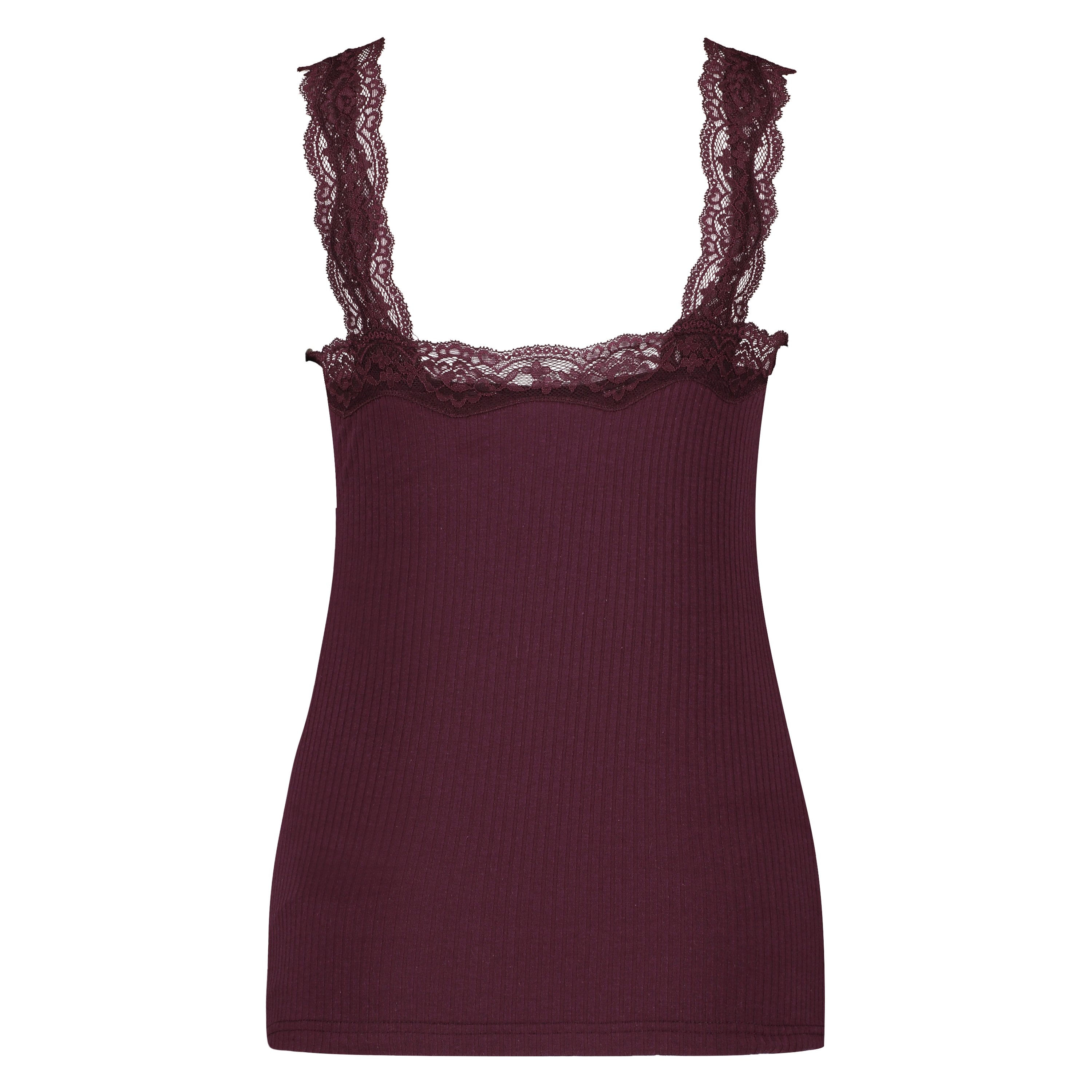 Denne camien er fremstilt med et ribbemønster. Øverst er den forseggjort med blondedetaljer. Kombiner med en av de matchende artiklene.