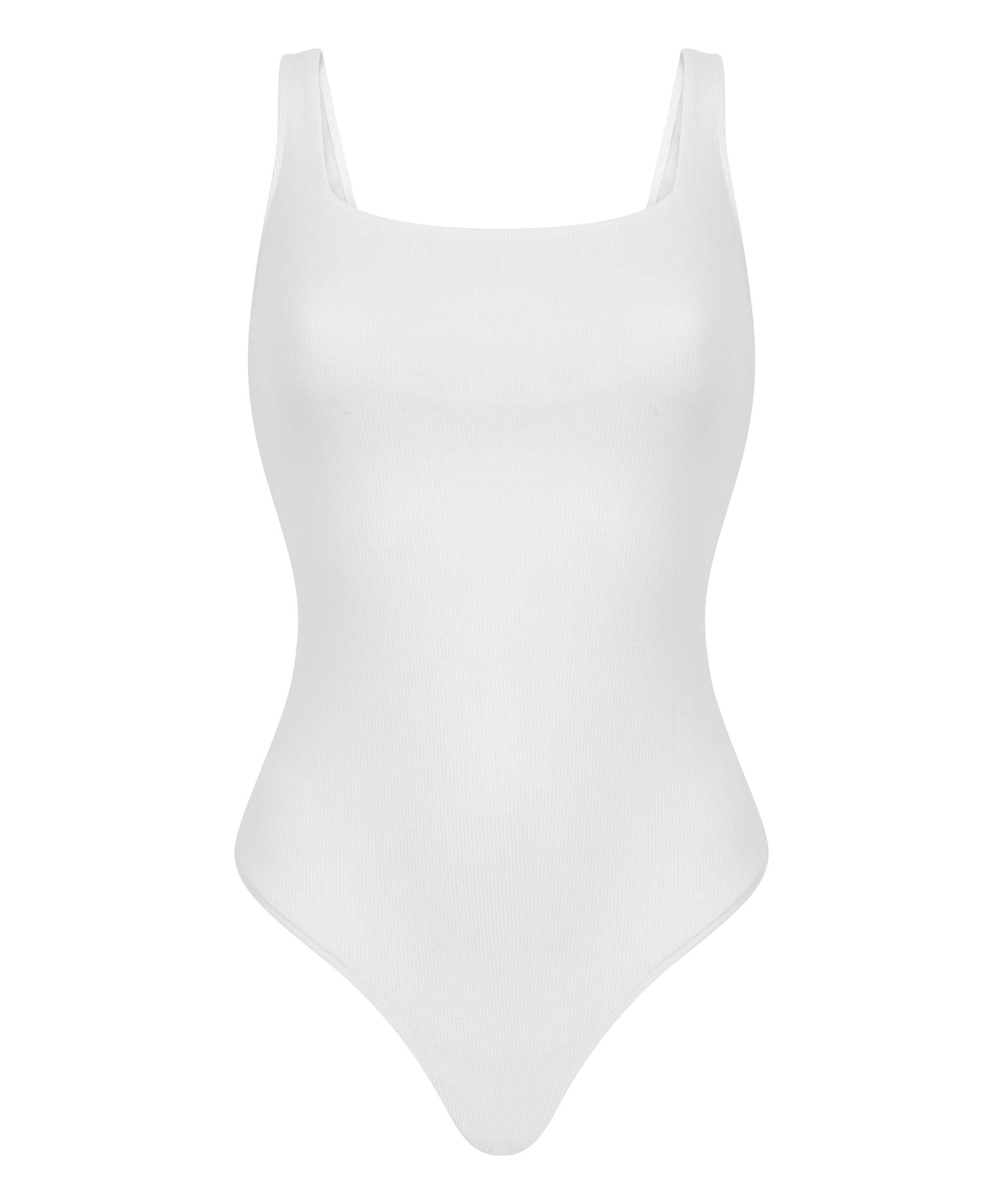 Bomullskropp i mykt, ribbet materiale med brede stropper for ekstra støtte og et ekstra stofflag i bysteområdet. Ryggen har en bred V-formet design og en tangaformet bunn.