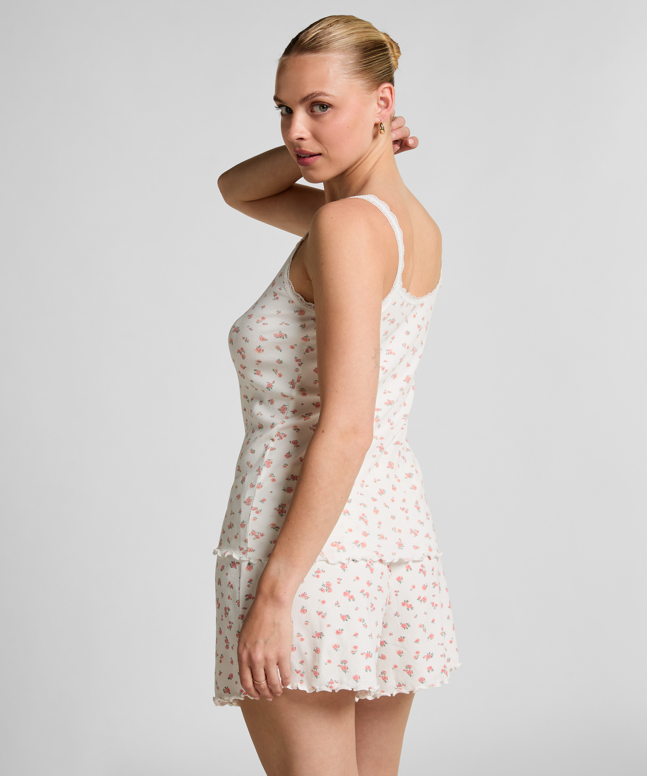Delikate detaljer for drømmende dager og netter! Denne ermeløse, ribbestrikkede cami-toppen har blondekantede stropper og utringning, en søt sløyfe foran og myke rysjer nederst – din favoritt med snev av sjarm og komfort.