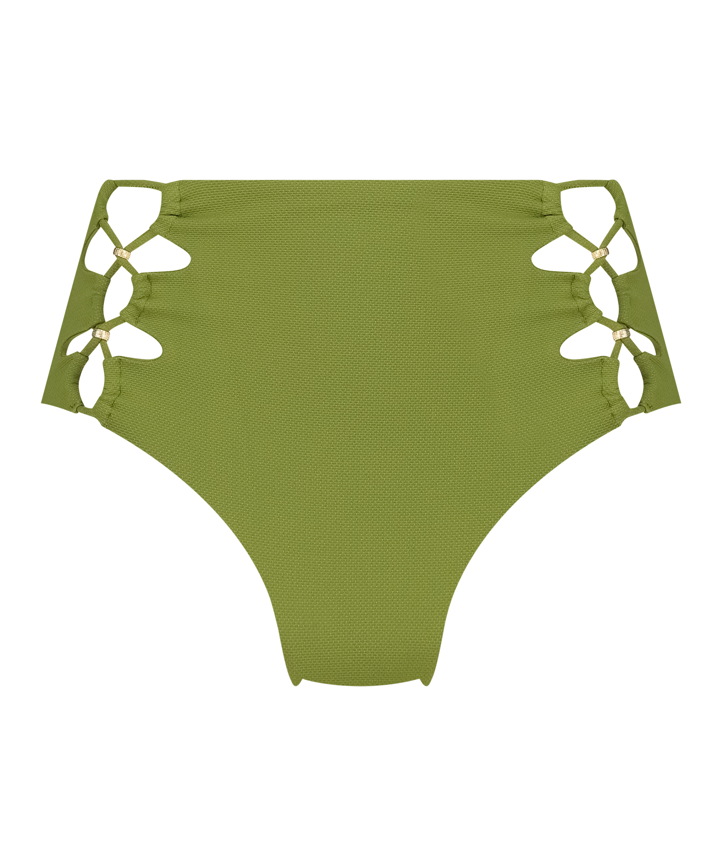 Ta steget inn i retroglamouren med vår nydelige bikinitruse med høy midje! Dette vintageinspirerte plagget har en smigrende høy midje som omslutter figuren din på de riktige stedene. Det delikate blondemønsteret på sidene tilfører et feminint preg og er utsmykket med luksuriøse gullfargede perler. Kombiner den med din favorittbikinitopp for en tidløs og elegant look!