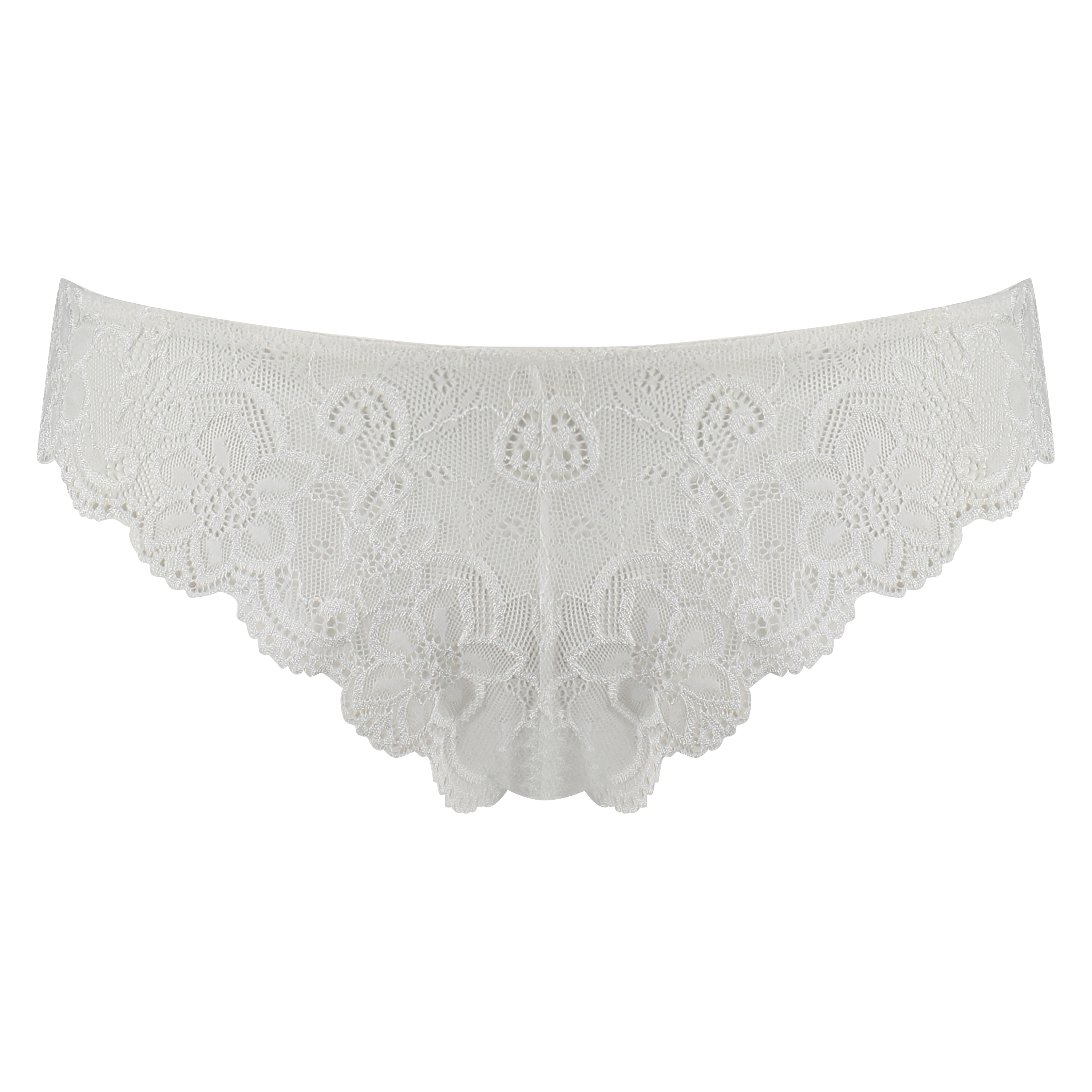 Denne brasilianske trusen er laget av halvt gjennomsiktig blondestoff med et blomstermønster. Blomstene i mønsteret er markert med en sort kantlinje.