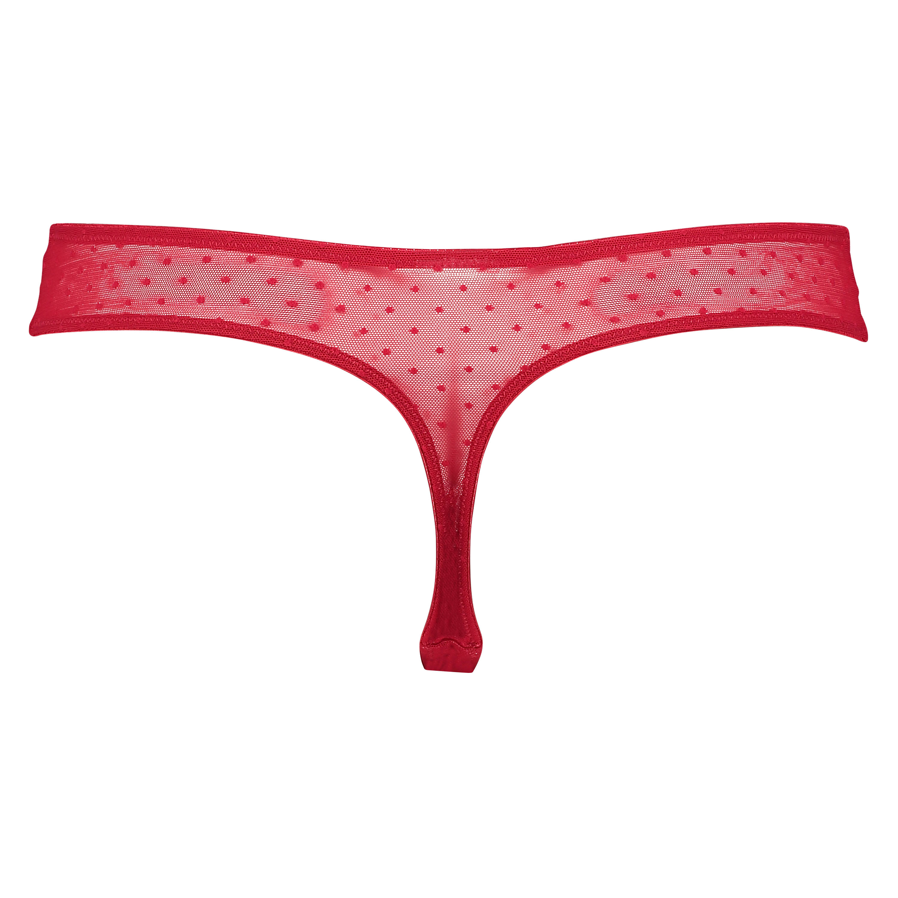 This black thong features lace details and an all-over dotted pattern. A small bow and a glittering diamante on the front add finishing touches.