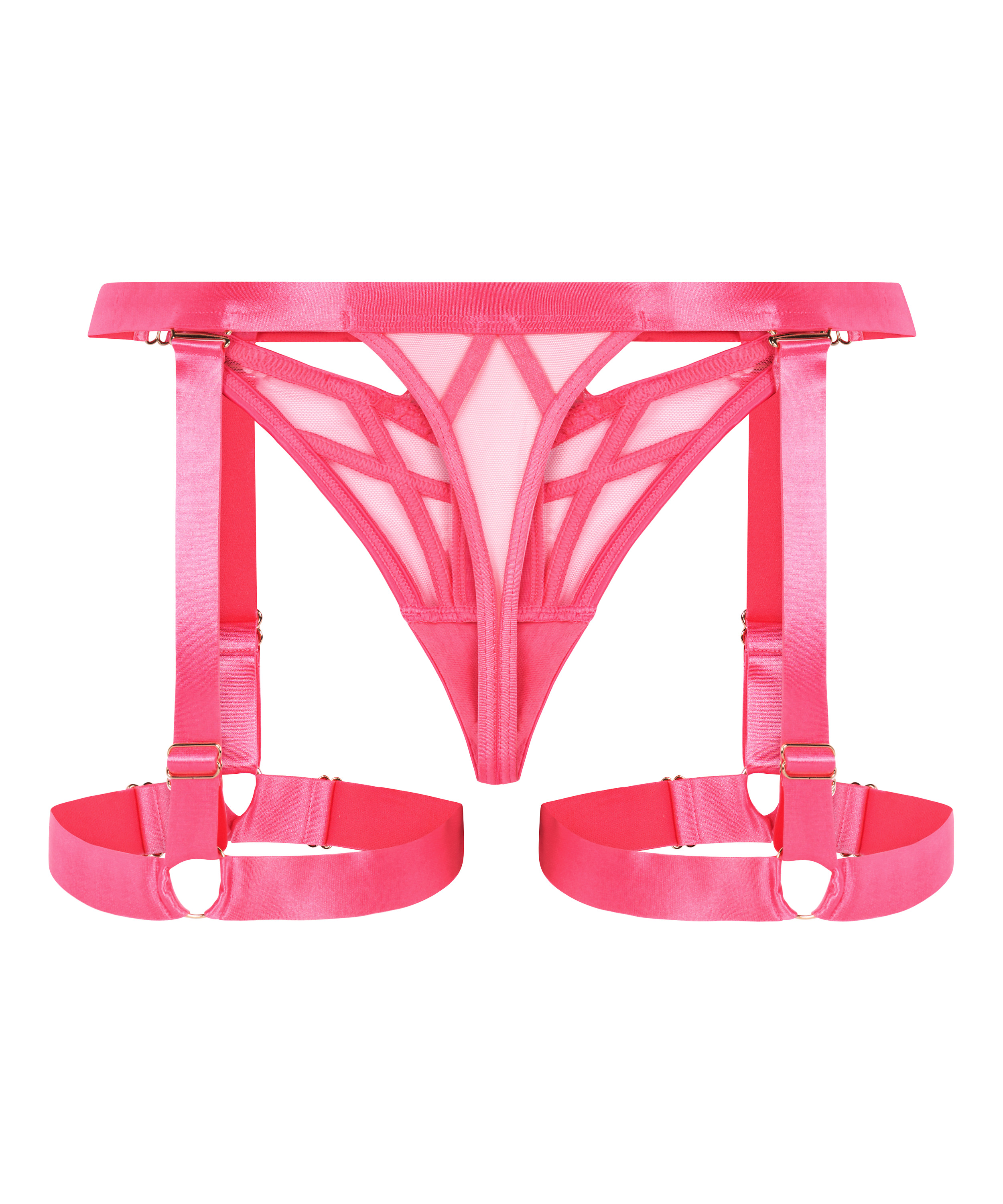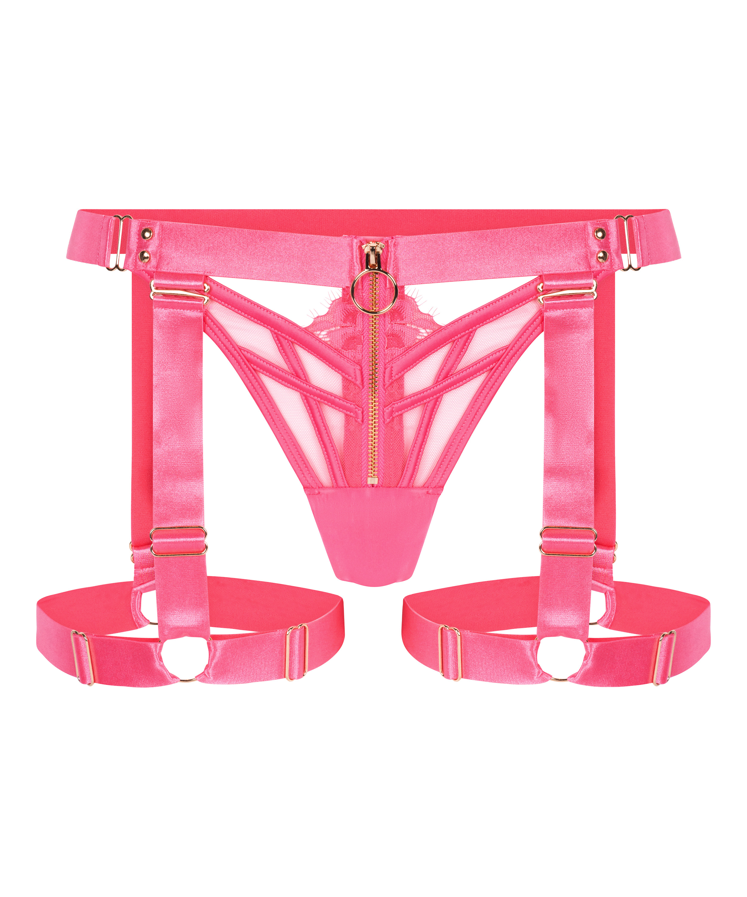 Våg å være dristig med denne G-strengen. Dette fengslende designet har utskjæringer som pirrer, mens sipper-detaljen foran gir en edgy touch. Avtakbare suspenders gir allsidige stylingalternativer. Del av den private kolleksjonen.