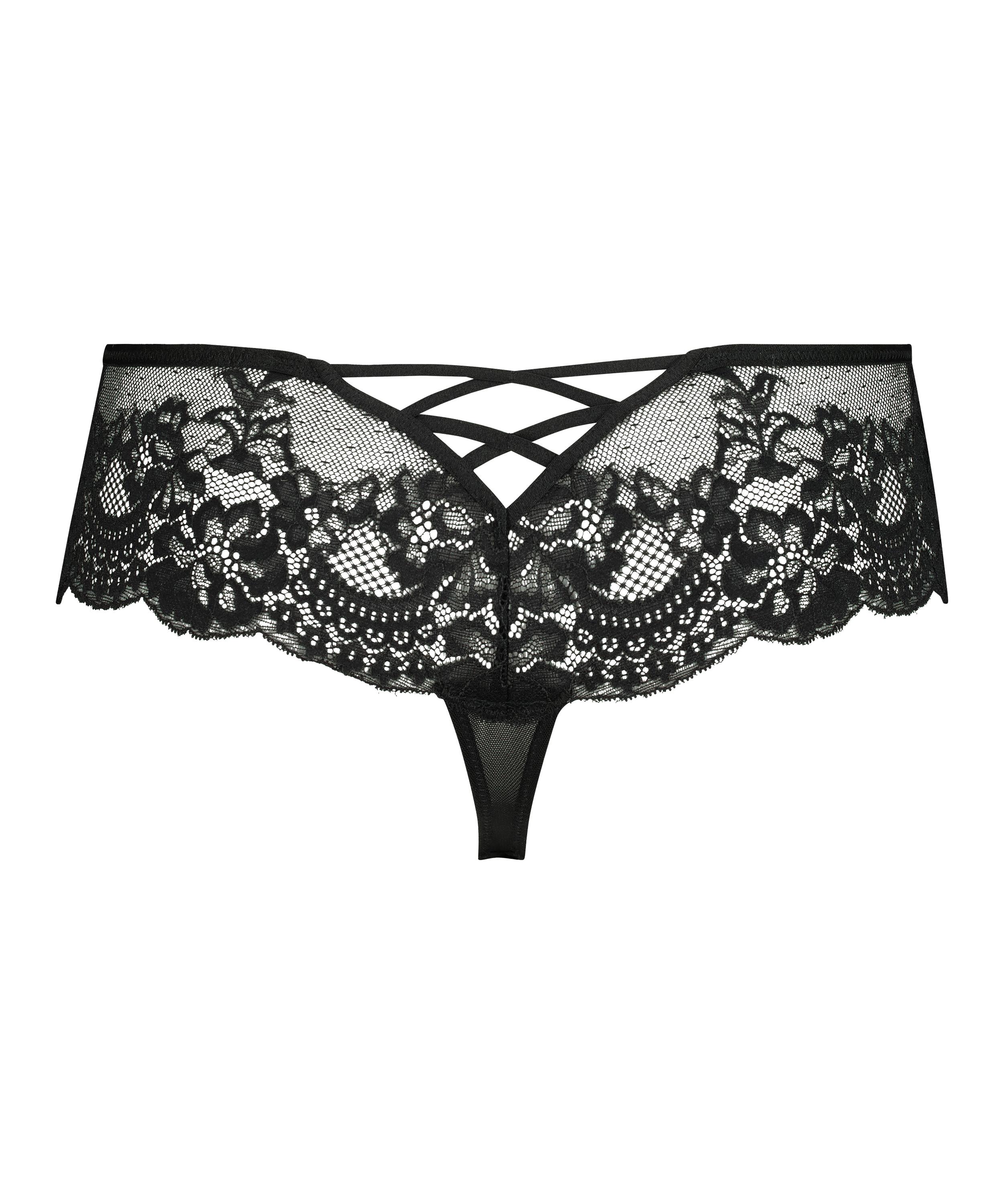 Hvor sexy er ikke denne hipster-stringen! Trusen inneholder et skinnende mikrostoff som gir en glamorøs effekt og er laget av masse blonder. I tillegg er det en elastisk v-åpning bak som gjør trusen ekstra sexy. Match med en passende BH og du har et prak