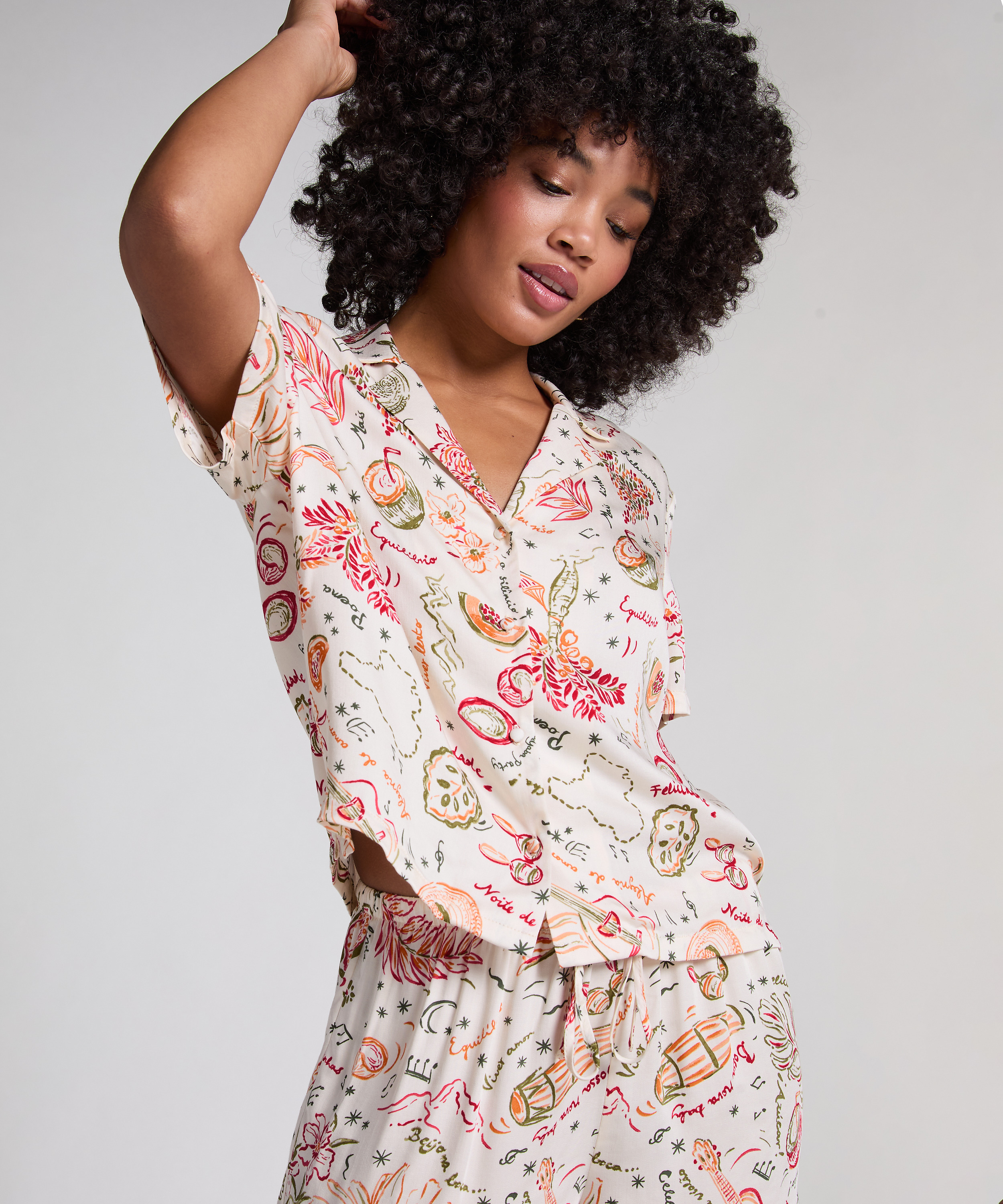 Denne sovetrøyen har et mykt, lett stoff som gir ultimat komfort for en avslappende natt. Den elegante kragen med brettet design og V-utringning gir et sofistikert preg. Stoffkledde knapper fullfører det raffinerte utseendet for en fredelig, men stilfull søvnopplevelse.