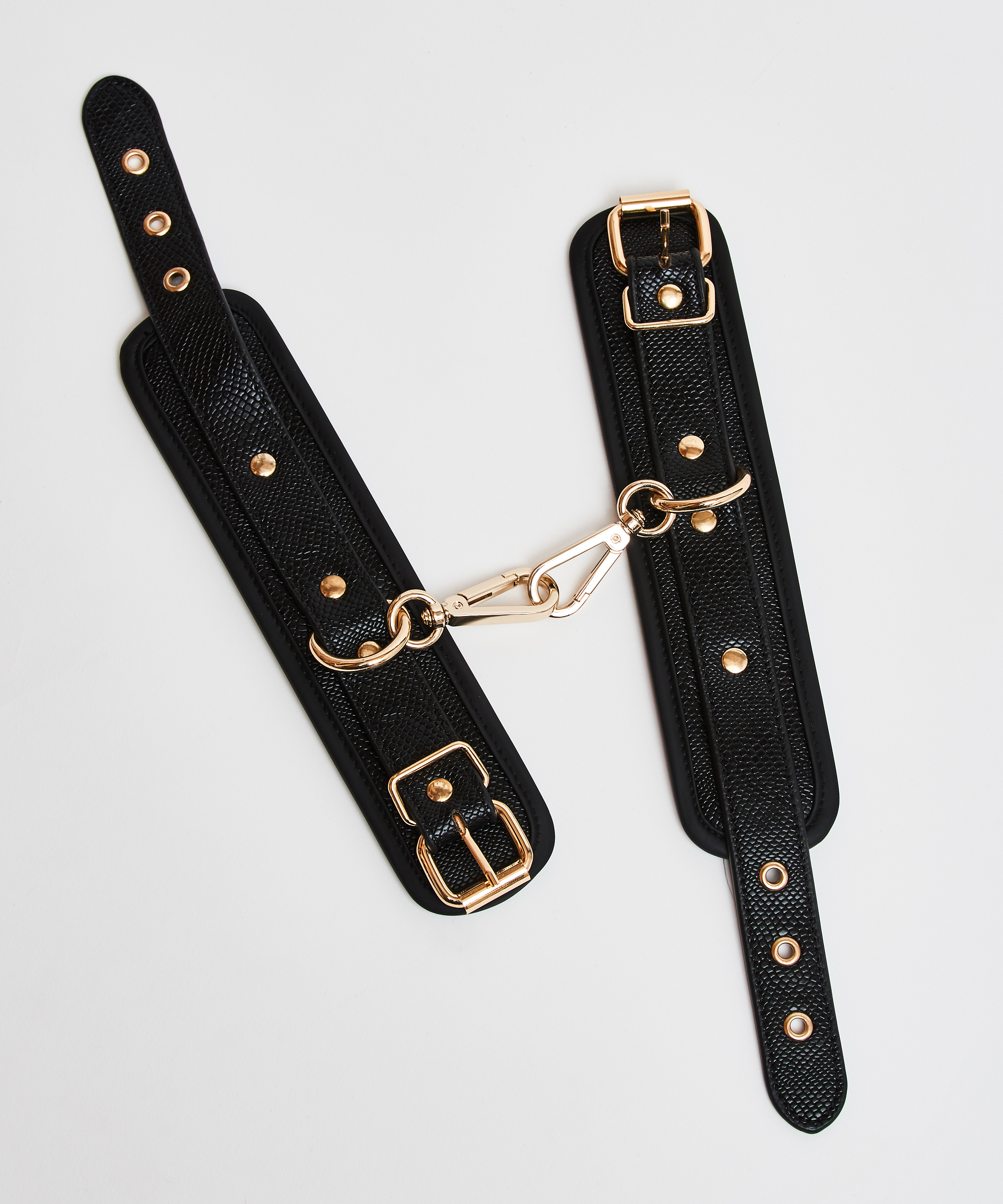 Gjør kvelden din ekstra spennende med disse håndjernene! Håndjernene har kunstlærdetaljer med slangetrykk og kan festes med gullåser. Kombiner med matchende artikler fra Private-kolleksjonen og du oppnår en sexy look!