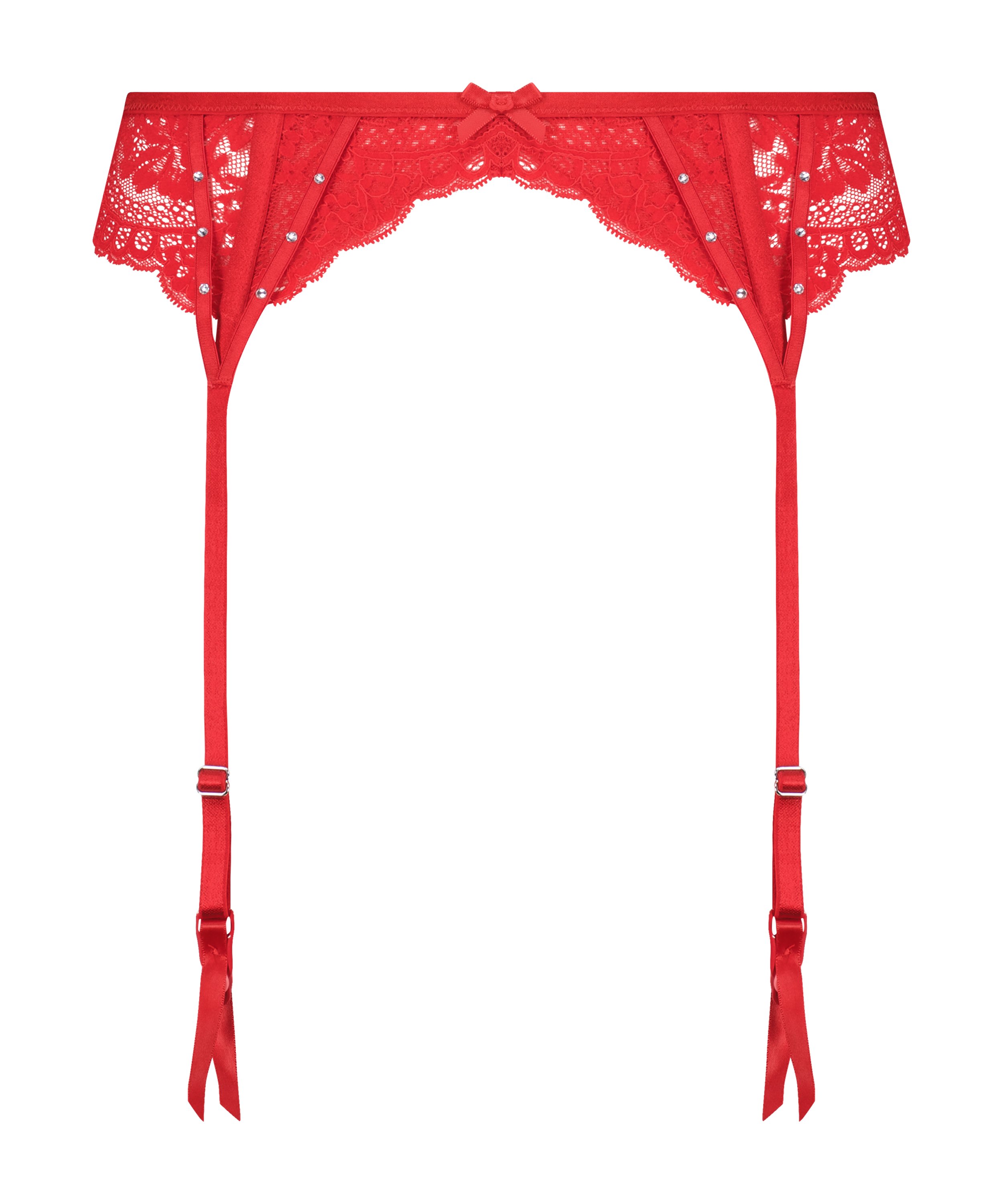 En vakker strømpeholder i klassisk design dekorert med artig strass. Designet med blomsterblonder langs kanten foran, og lukkes med hekter bak. Strømpeholderen former midjen og er flatterende. Bruk den sammen med Mariah-BH-en, -truse samt matchende strømper for en nydelig gjennomført stil.