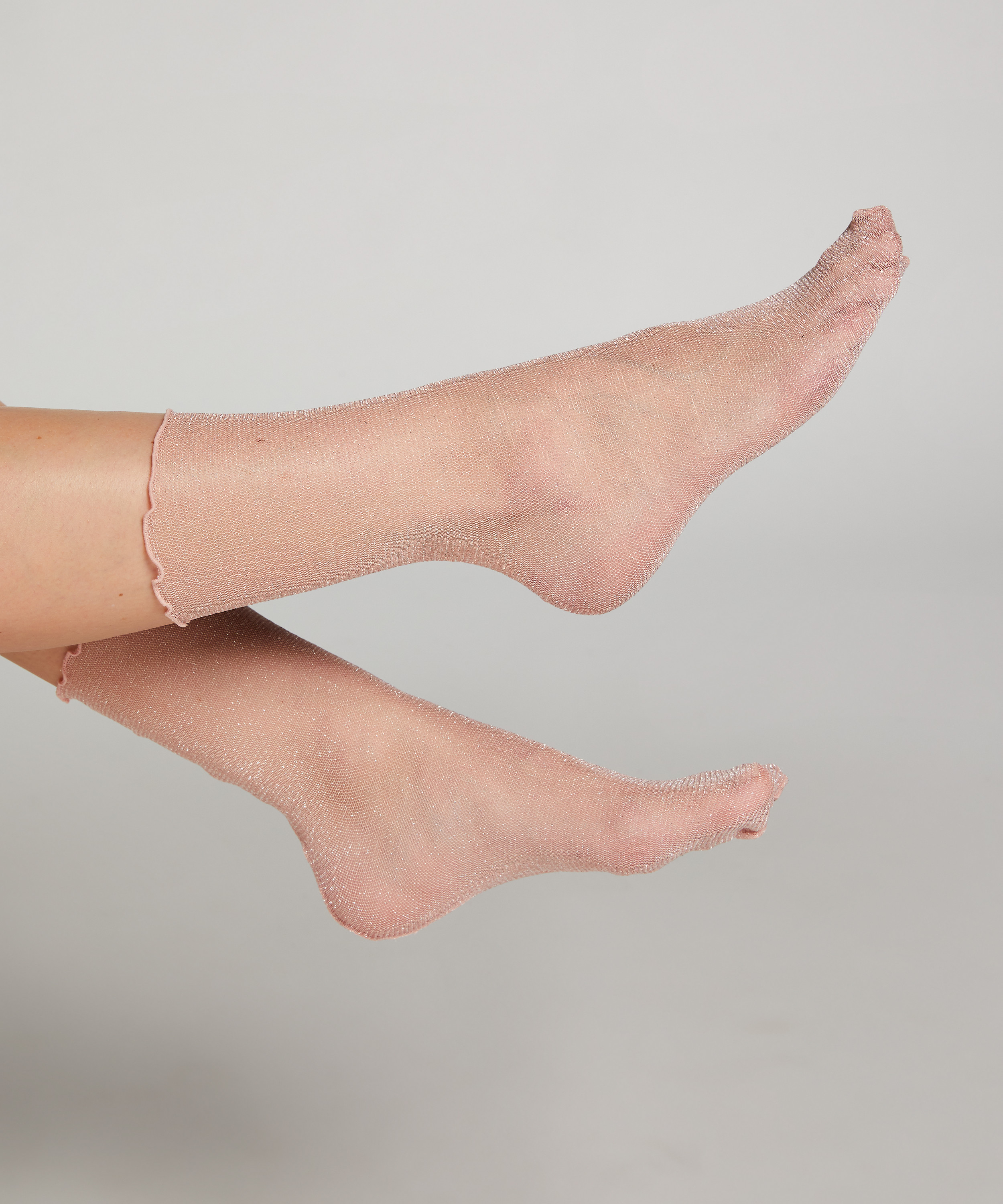 Disse knestrømpene er både elegante og glamorøse, det er en fremtredende kontrast mellom det gjennomsiktige materialet og den subtilt glitrende overflaten.