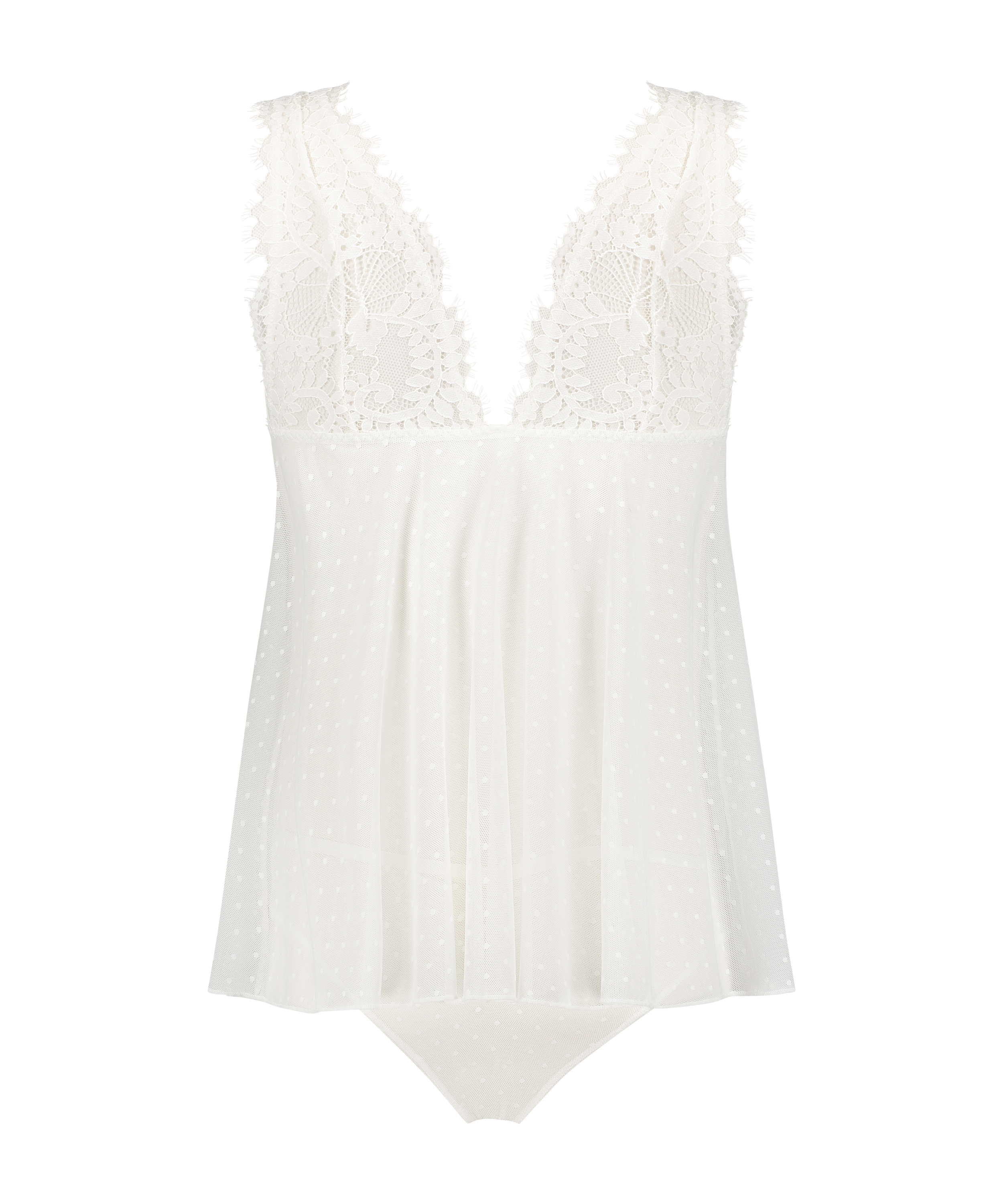 På jakt etter et camisett som både er elegant og komfortabelt på samme tid? Da er dette camisettet perfekt! Overdelen har en v-hals og blondedetaljer. Trusen er for en stor del laget av mesh-stoff med et motiv.