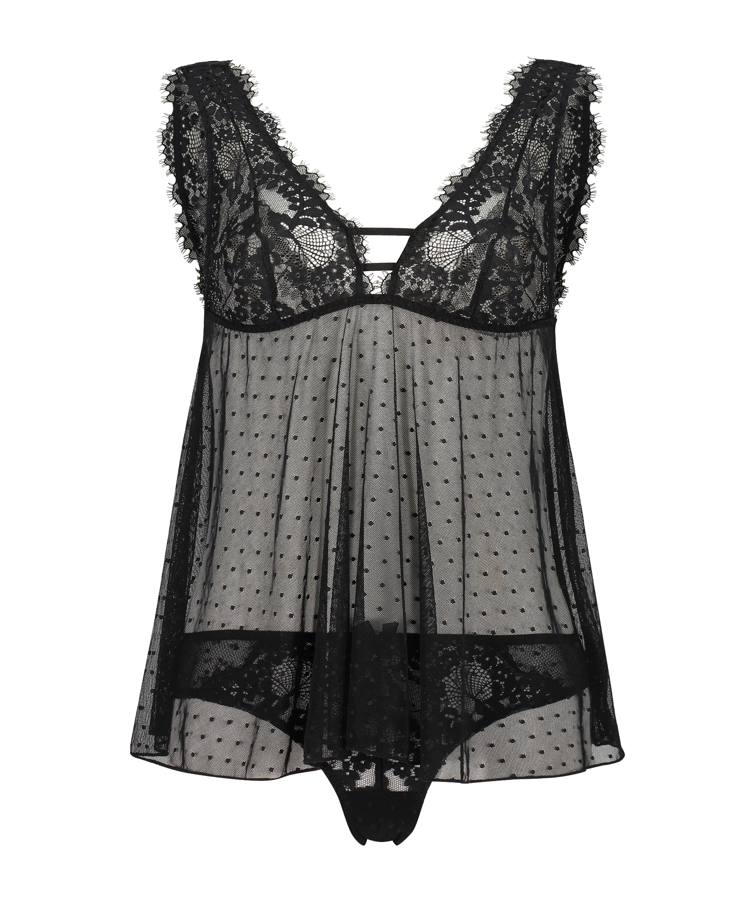 På jakt etter et camisett som både er elegant og komfortabelt på samme tid? Da er dette camisettet perfekt! Overdelen har en v-hals og blondedetaljer. Trusen er for en stor del laget av mesh-stoff med et motiv.
