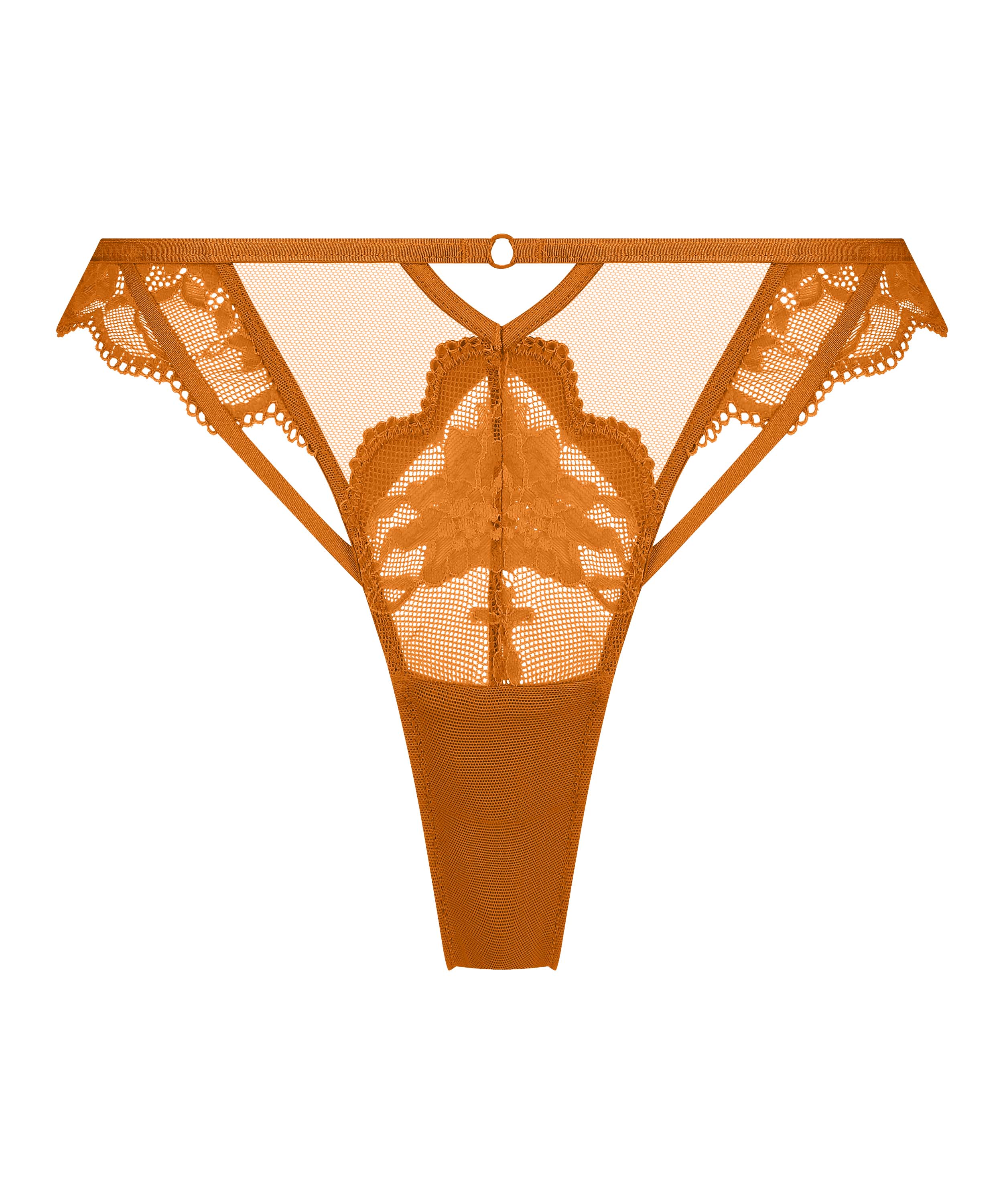 Få mer selvtillit med denne sexy tangaen! Den er laget i et fint blondestoff, med utskjæringer og stroppdetaljer foran. Kombiner den med den BH-en du liker best for et fint undertøyssett.