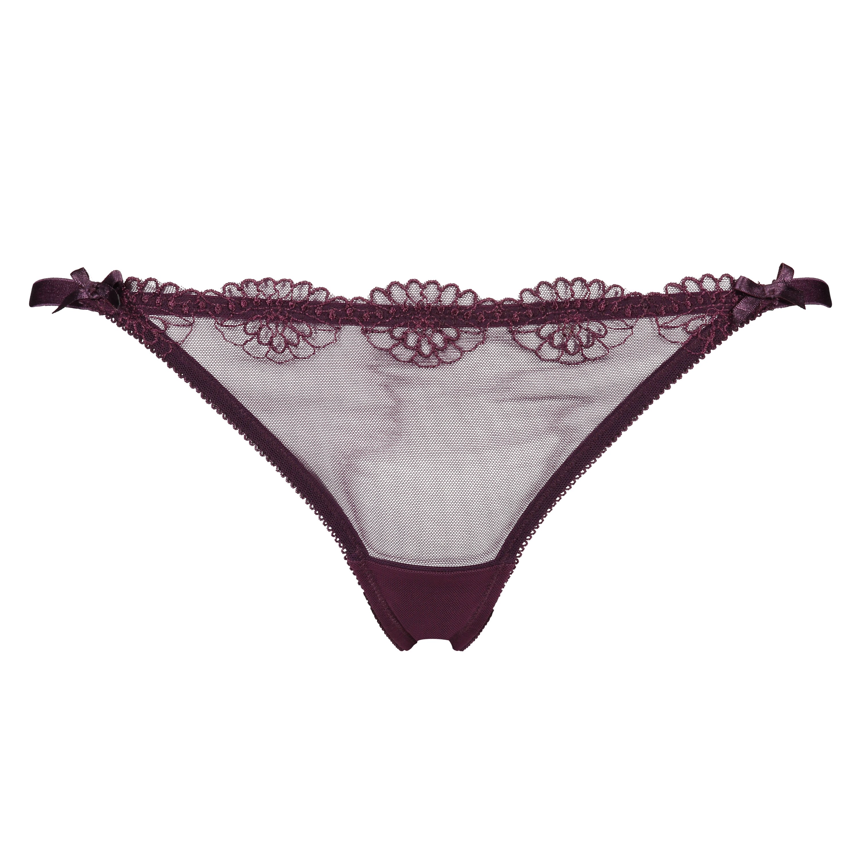 This semi-transparent thong features floral embroidery on the front and thin straps. The bows on the hips add finishing touches.