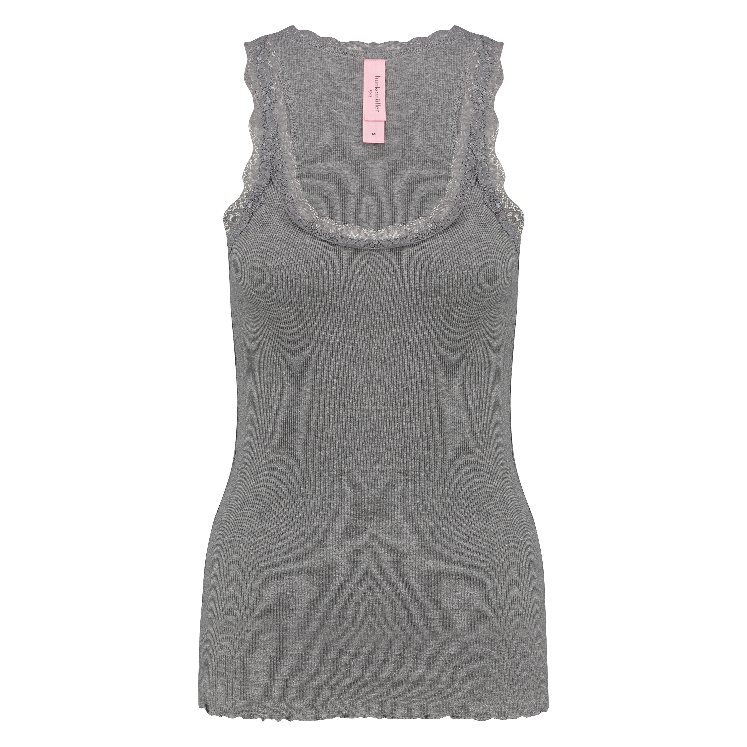 This singlet features a ribbed pattern and is finished with lace edging with a floral pattern.