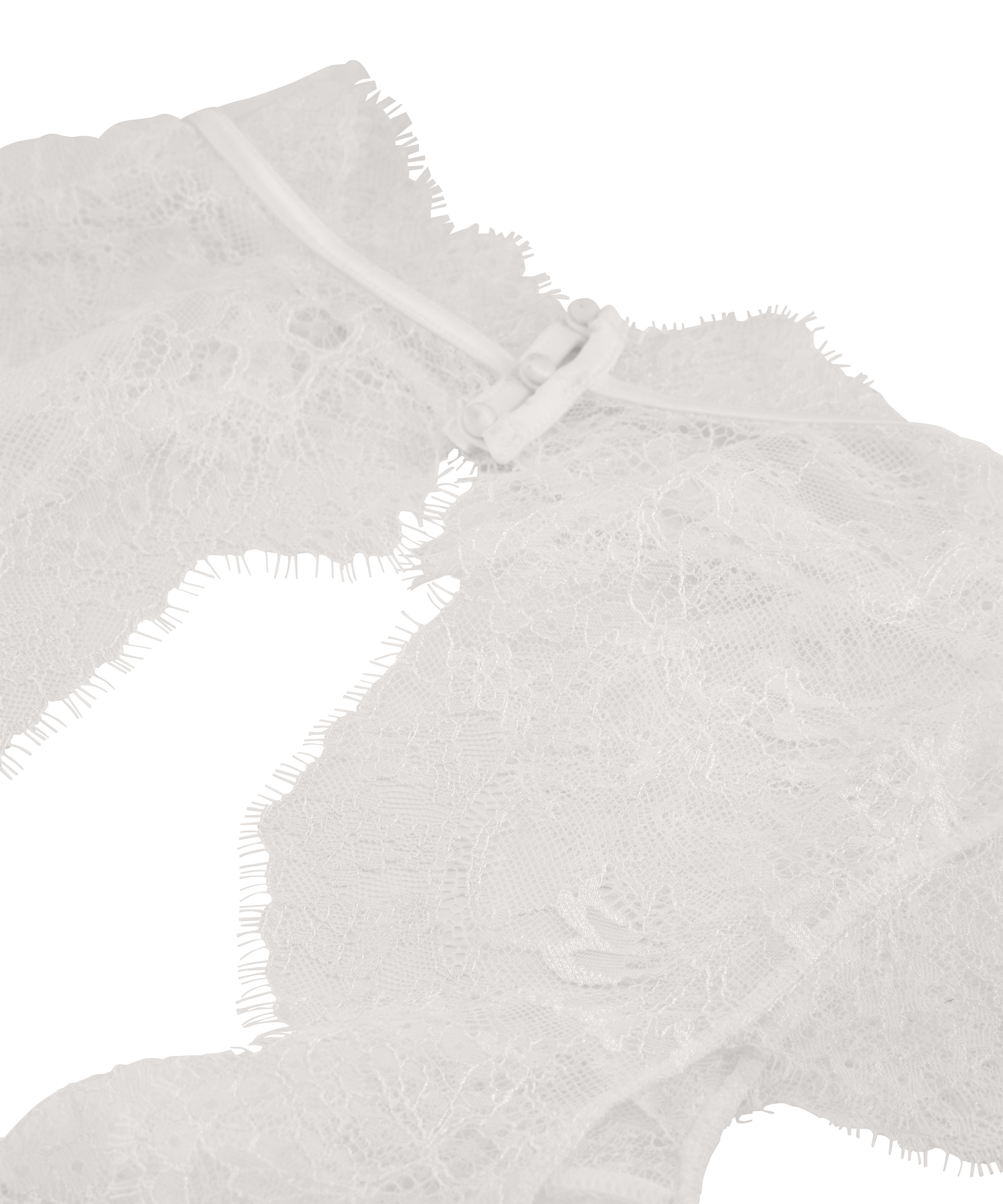 Channel din indre gudinne i denne utsøkte toppen! Den er laget av delikate blomstrete blonder og har utringning foran og bak for en skulpturell silhuett. De uvatterte skålene i to lag gir en halvtransparent look, mens bøylene sørger for optimal støtte. For ekstra bekvemmelighet kan BH-en festes med fem hekte- og øyelukninger. Den har blondekantet skilpaddehals og korte ermer med knappelukking, og utstråler eleganse fra alle vinkler. Den er del av vår Noir-kolleksjon. Fullfør looken ved å kombinere den med Camille French Lace-truser for et virkelig fengslende ensemble!