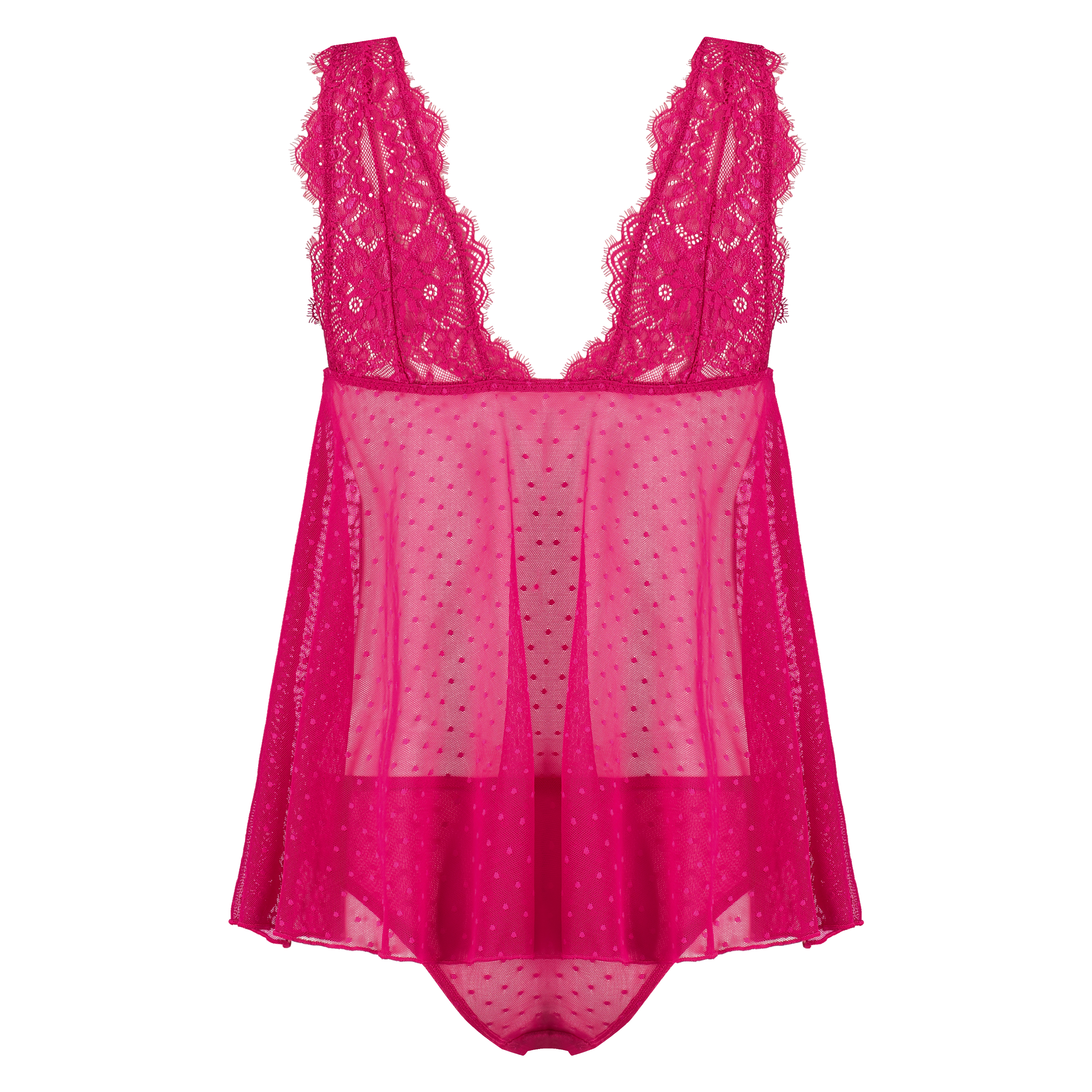 Hvor søtt er dette camisettet? Toppen består av mesh og blonder og er forseggjort med strappy detaljer. Den matchende trusen er laget av en blanding av blonder og mesh.