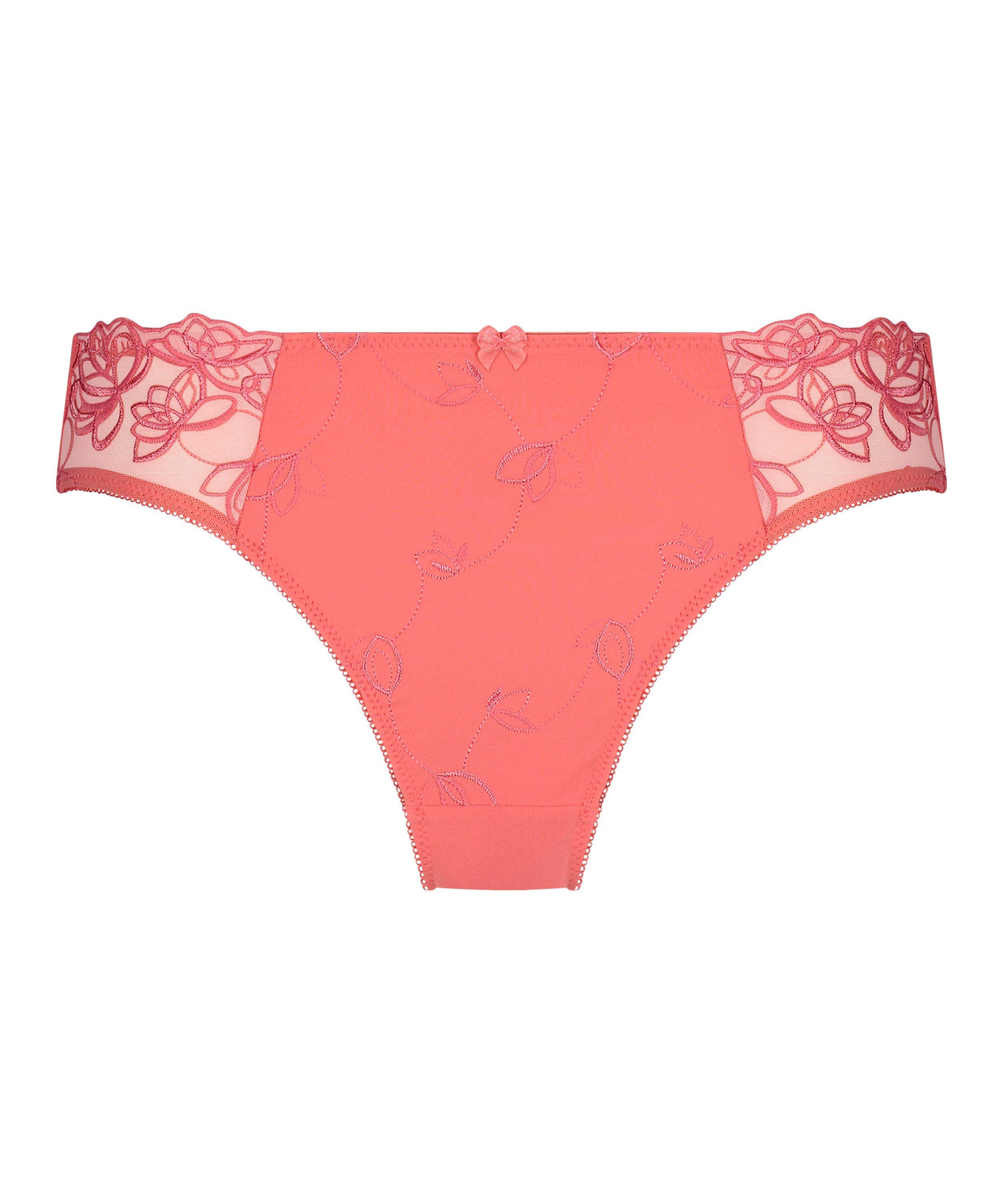 Denne høye trusen er laget av et føyelig, glatt stoff som gir en nydelig passform, og er dekorert med blomsterbroderinger og en liten sløyfe foran.