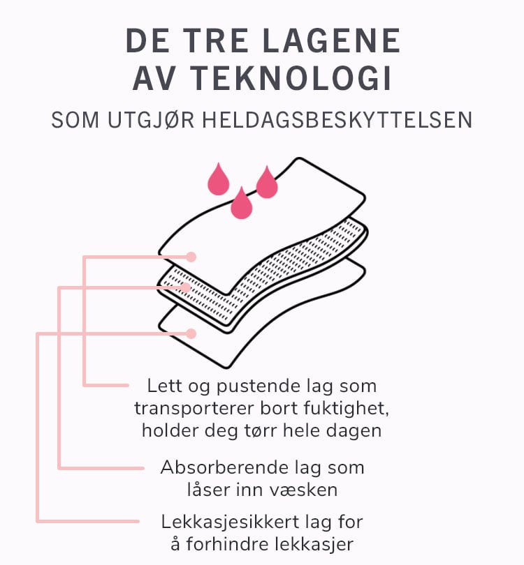 - ● Lekkasjefritt: Den absorberende teknologien med flere lag sørger for at du ikke trenger å bekymre deg for lekkasjer.