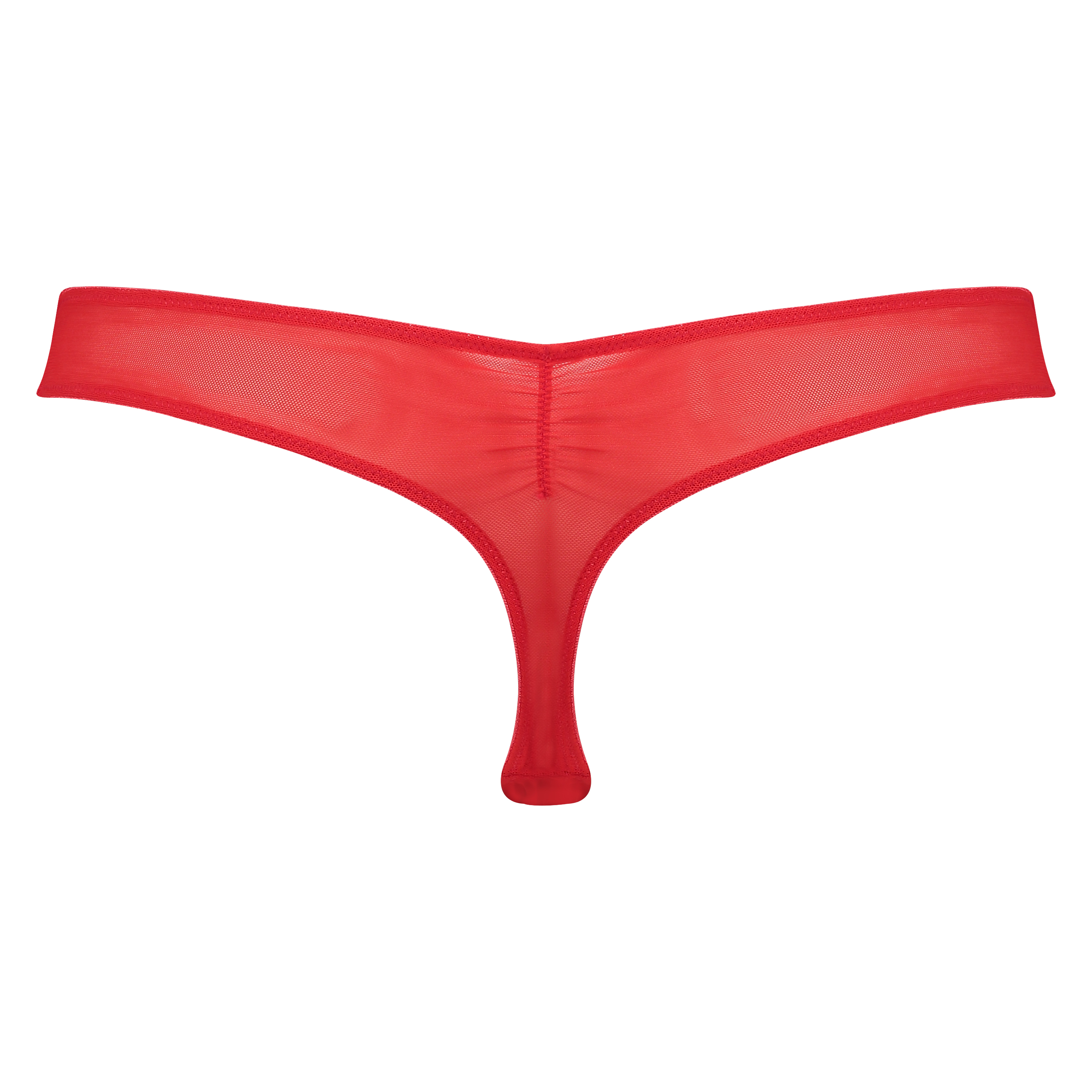 This sexy thong has semi-transparent fabric on the front with a lace pattern and is finished on the front with a small bow and a glittering diamante.