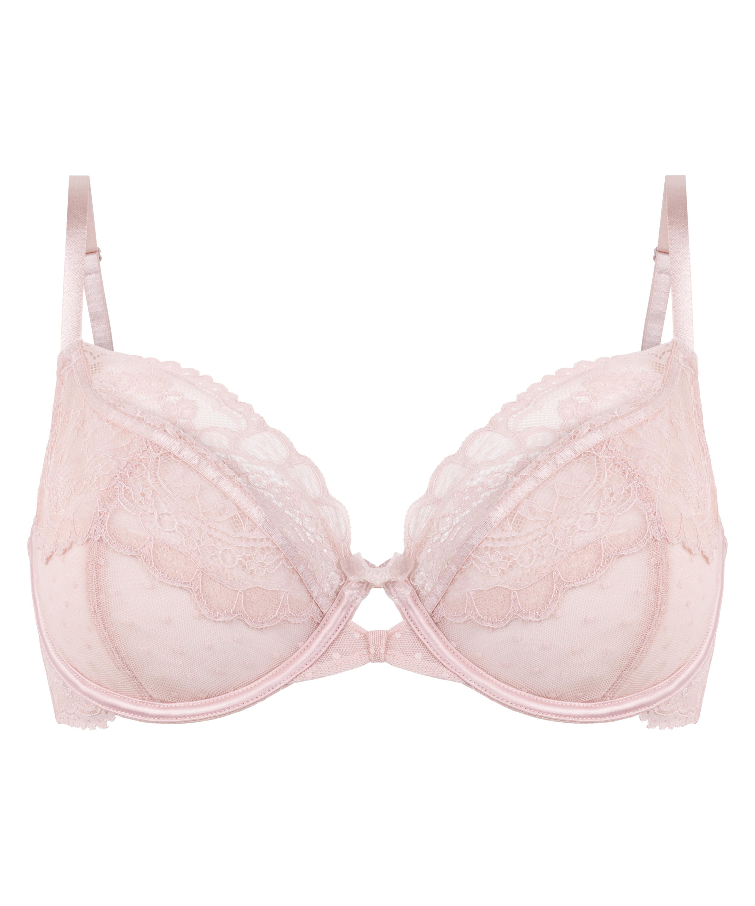 Denne BH-en tilfører et feminint preg til undertøyskolleksjonen din. Blonder på toppen av koppene gir en romantisk følelse, mens det prikkete meshmønsteret på undersiden gir en leken kontrast. Med støttende bøyler og en elegant sløyfe i midten kombinerer denne BH-en komfort og stil.