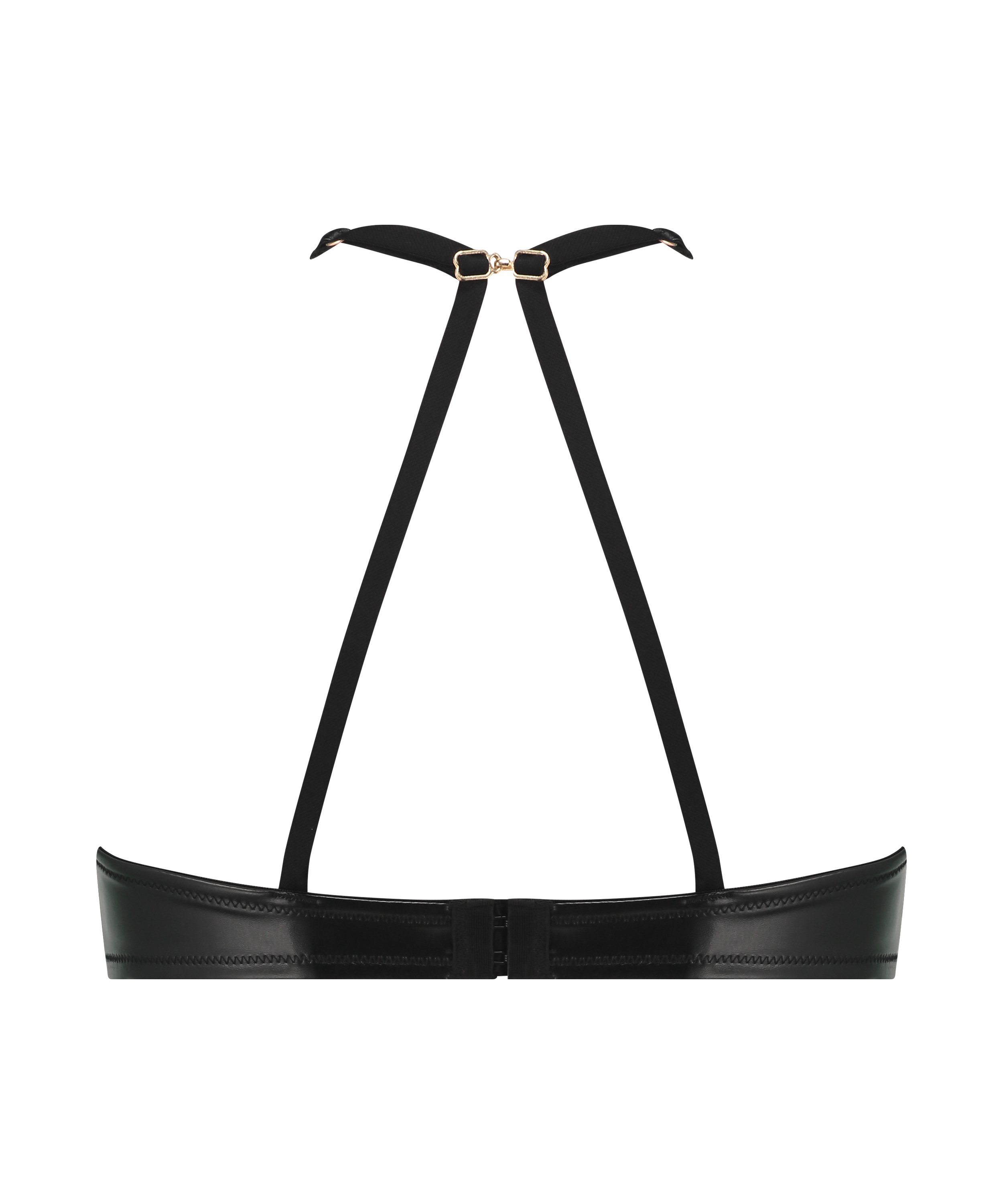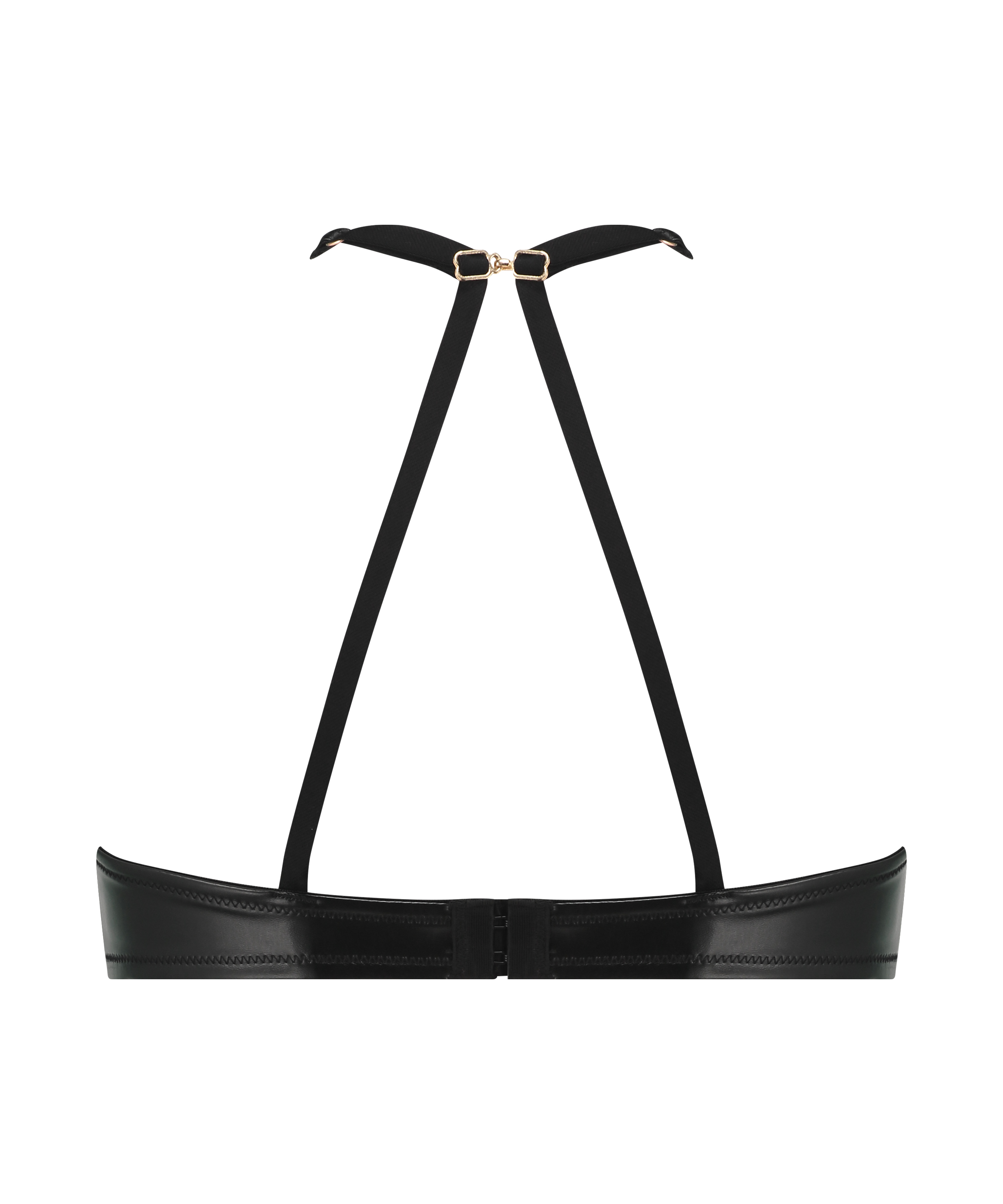 Denne bh-en har et elegant design i svart imitert skinn med delikate gulldetaljer. Den dype utringningen gir en dristig touch, mens de justerbare stroppene sikrer en skreddersydd passform. Underwire-koppene gir støtte og form. Bh-en er designet for å flatter figuren din og gi et glamorøst utseende.
